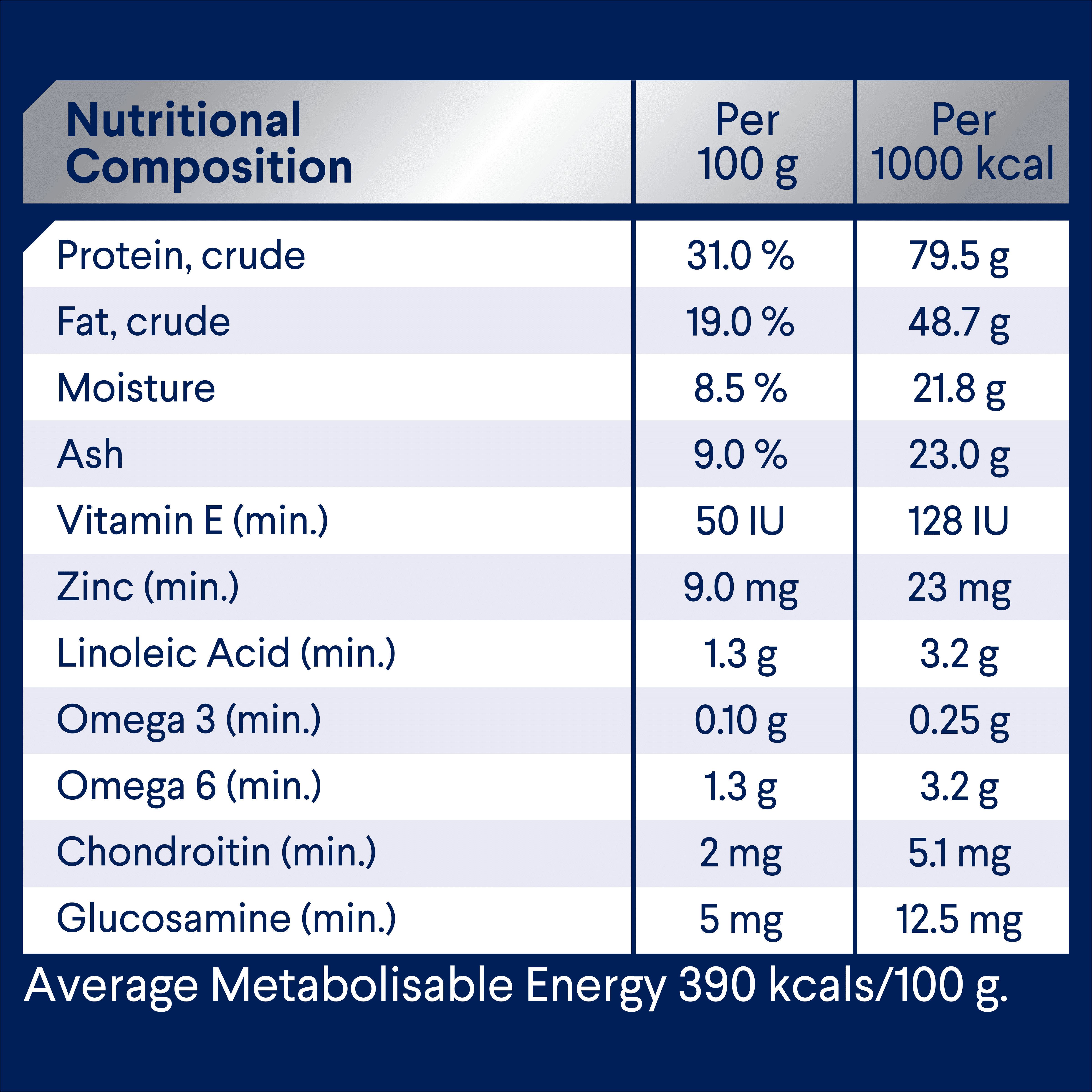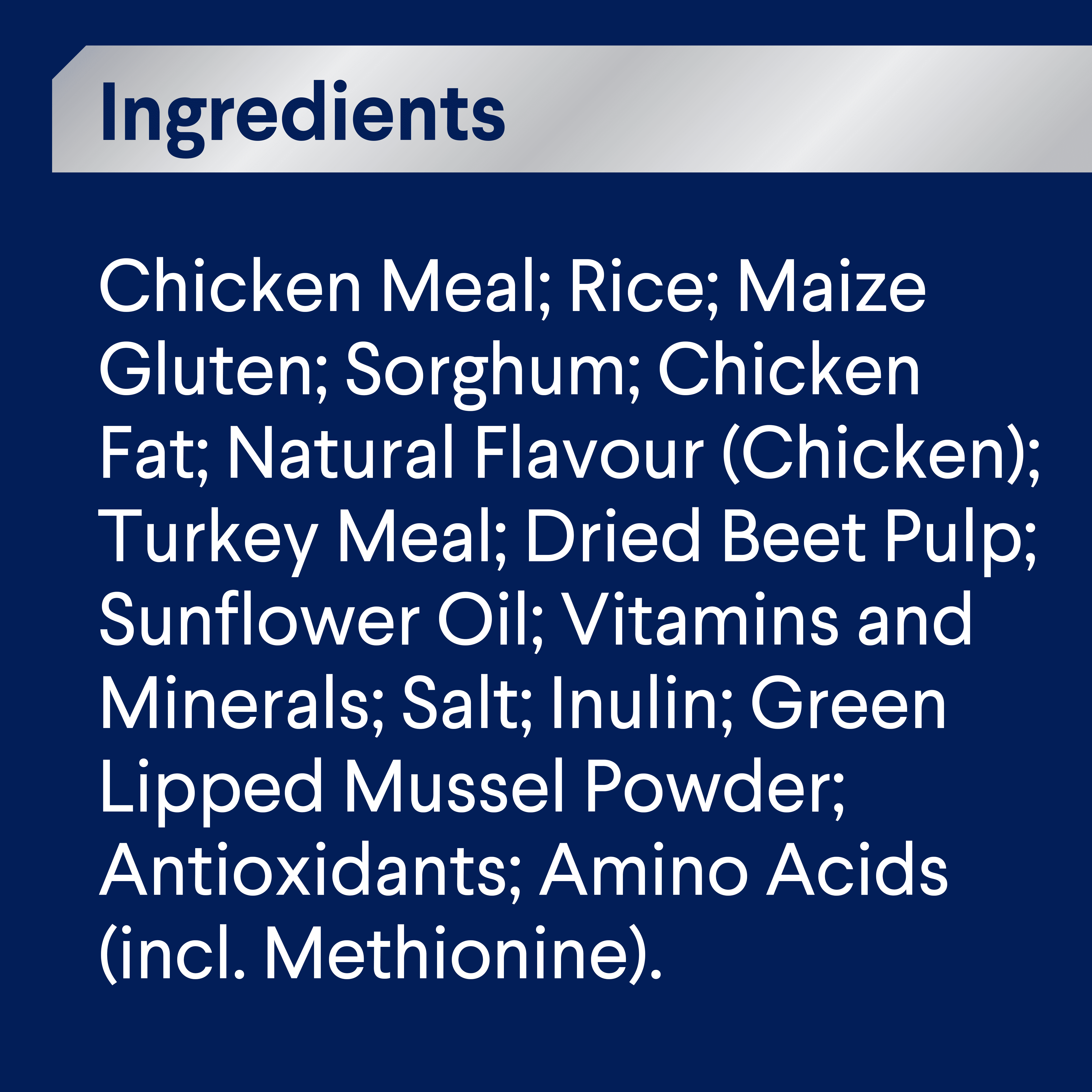 Chicken Meal; Rice; Maize Gluten; Sorghum; Chicken Fat; Natural Flavour (Chicken); Turkey Meal; Dried Beet Pulp; Sunflower Oil; Vitamins and Minerals; Salt; Inulin; Green Lipped Mussel Powder; Antioxidants; Amino Acids (incl. Methionine).