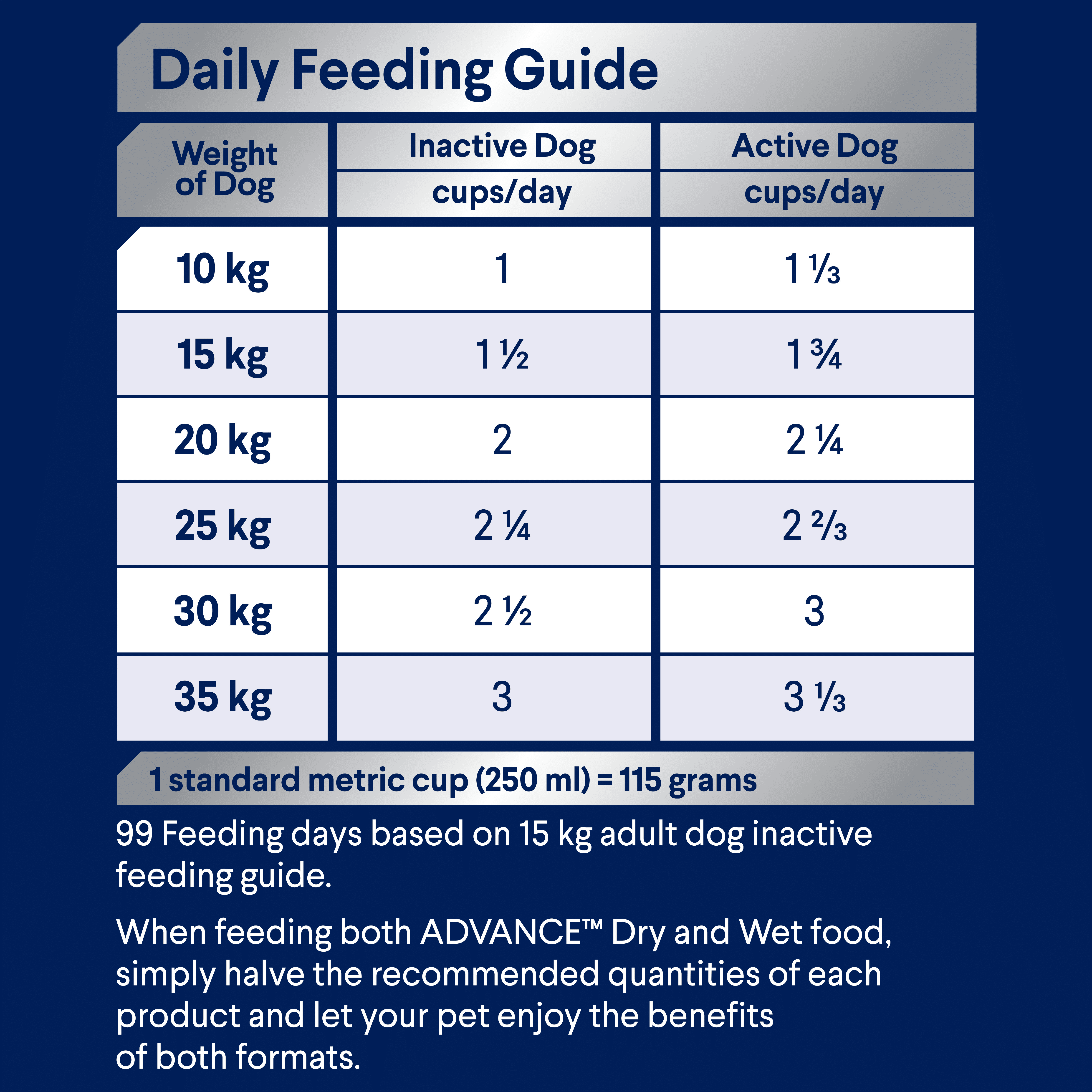 When feeding both ADVANCE™ Dry and Wet food, simply halve the recommended quantities of each product and let your pet enjoy the benefits of both formats.