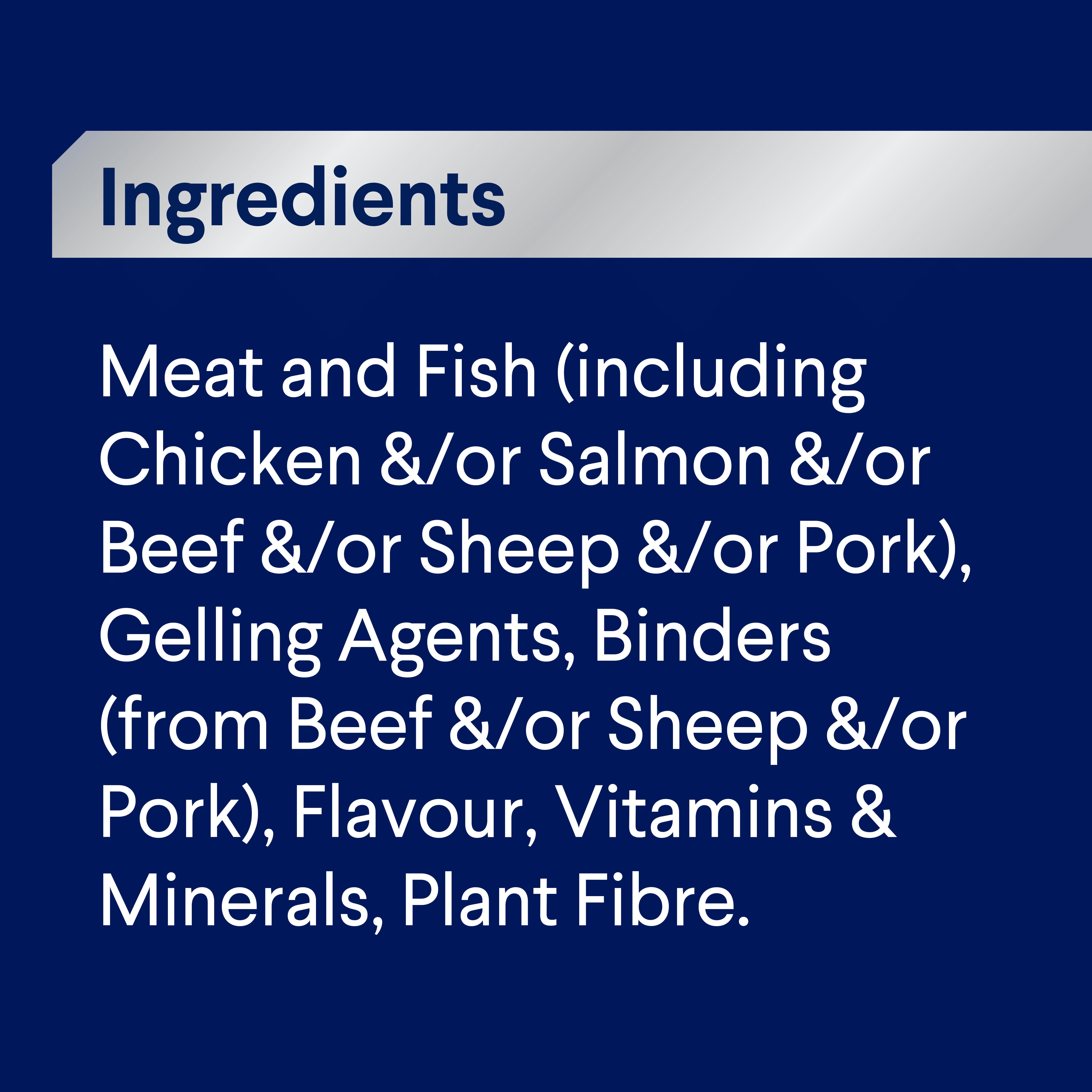 Meat and Fish (including Chicken &/or Salmon &/or Beef &/or Sheep &/or Pork), Gelling Agents, Binders (from Beef &/or Sheep &/or Pork), Flavour, Vitamins & Minerals, Plant Fibre.