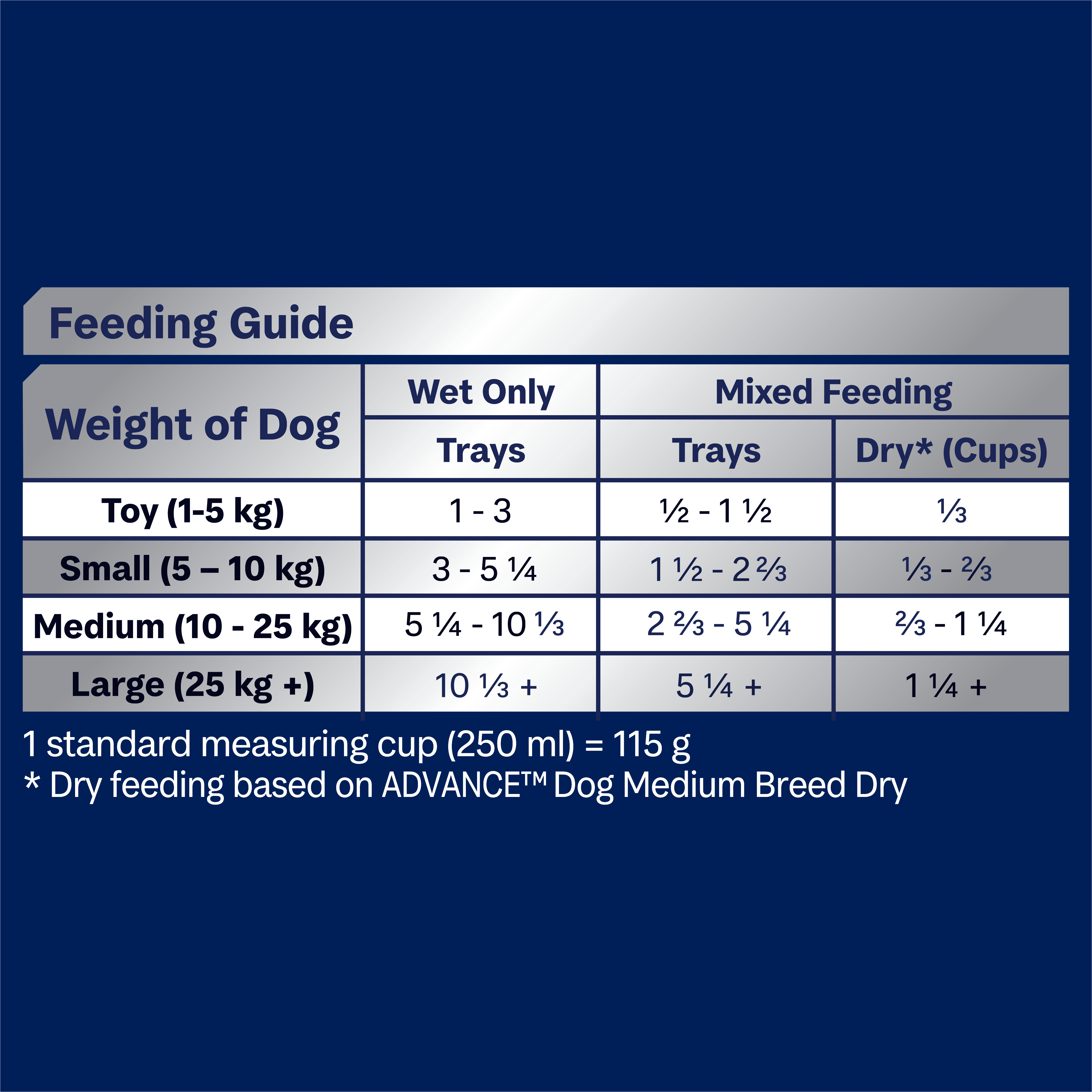 When feeding both Wet and Dry food, simply halve the recommended quantities of each product and let your pet enjoy the best of both formats. The amount of food your dog requires will vary depending on age and activity level.