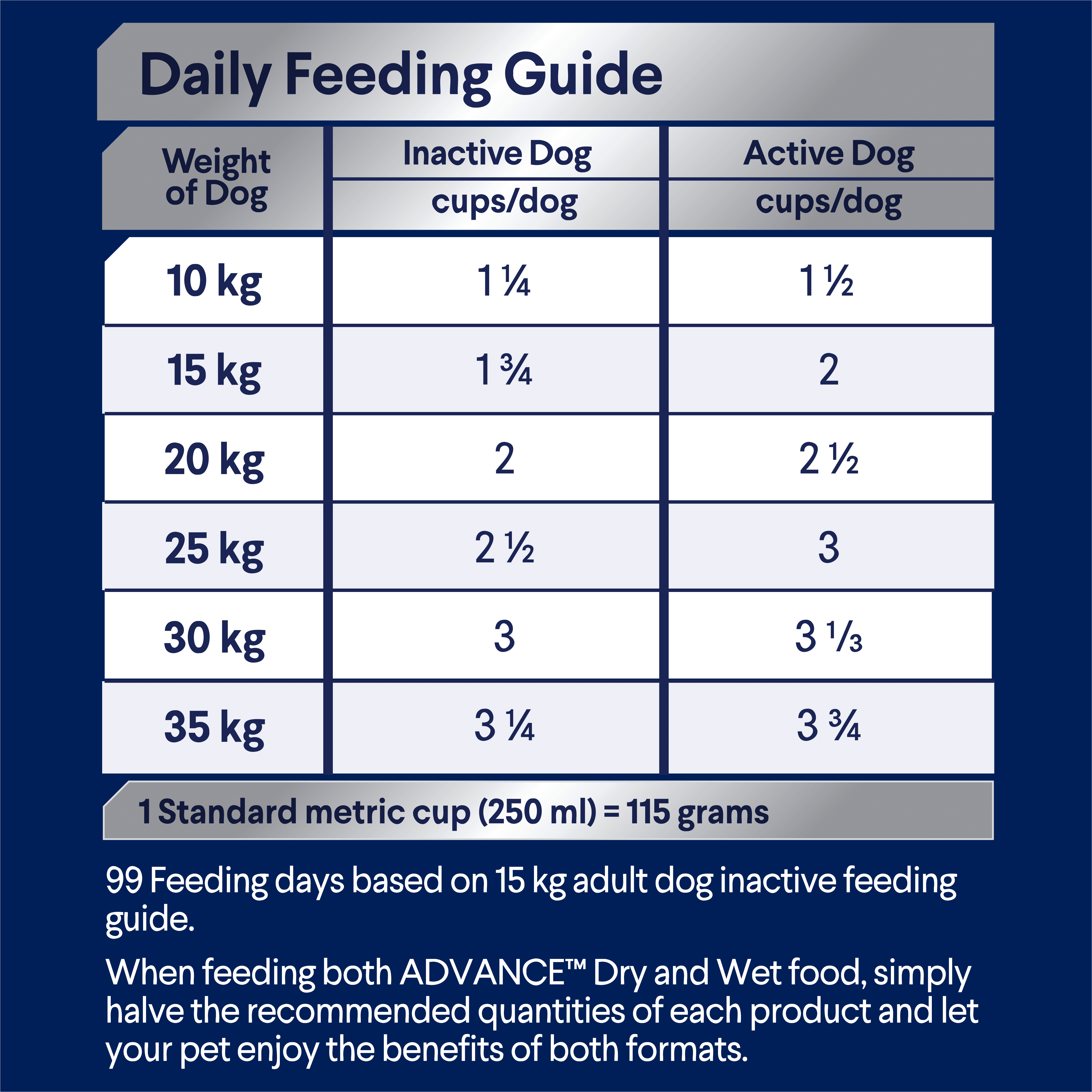 When feeding both ADVANCE™ Dry and Wet food, simply halve the recommended quantities of each product and let your pet enjoy the benefits of both formats.