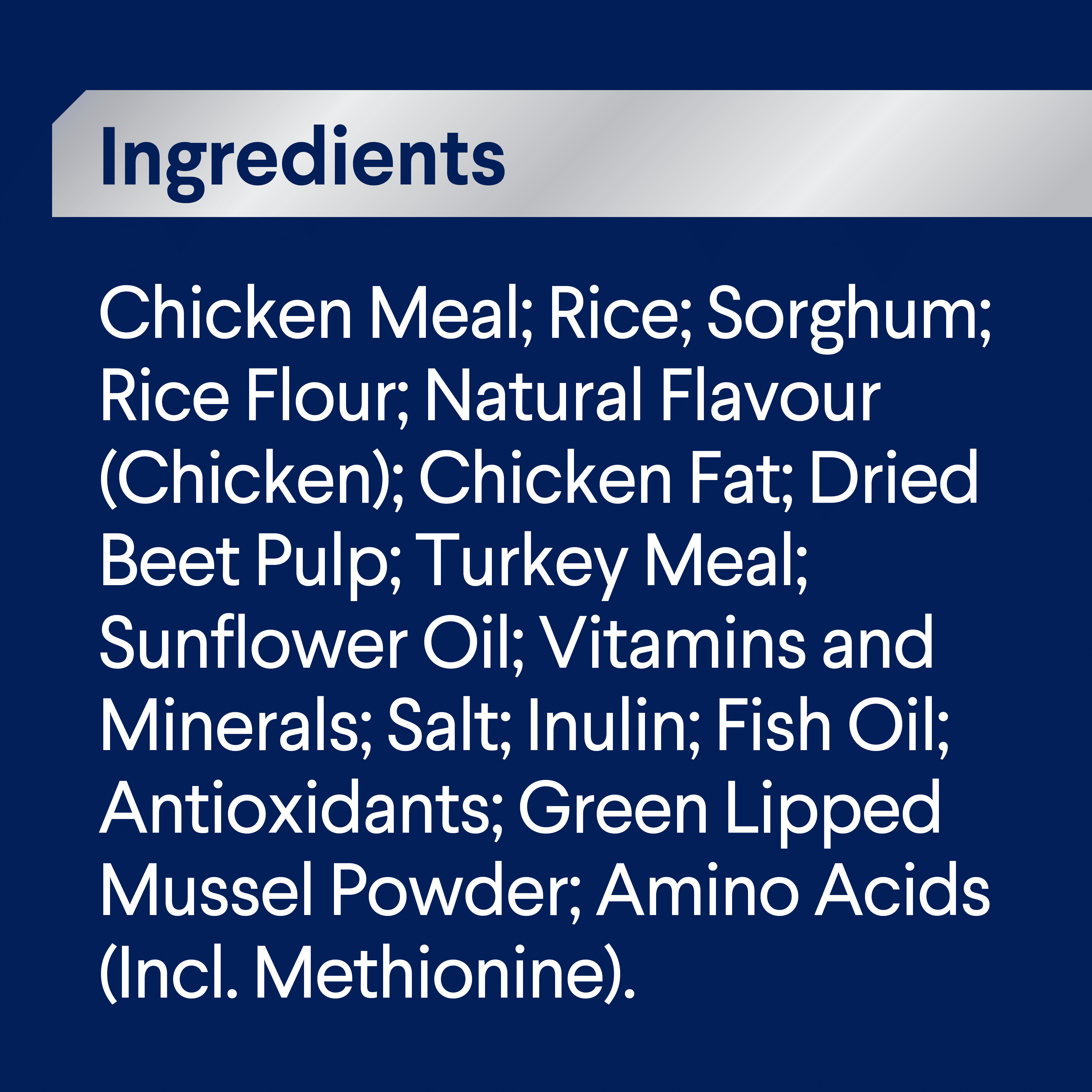 Chicken Meal; Rice; Sorghum; Chicken Fat; Rice Flour; Dried Beet Pulp; Natural Flavour (Chicken); Turkey Meal; Vitamins and Minerals; Salt; Sunflower Oil; Inulin; Sodium Tripolyphcsphate; Antioxidants; Amino Acids (incl. Methionine); Plant Extracts (source of Catechins).