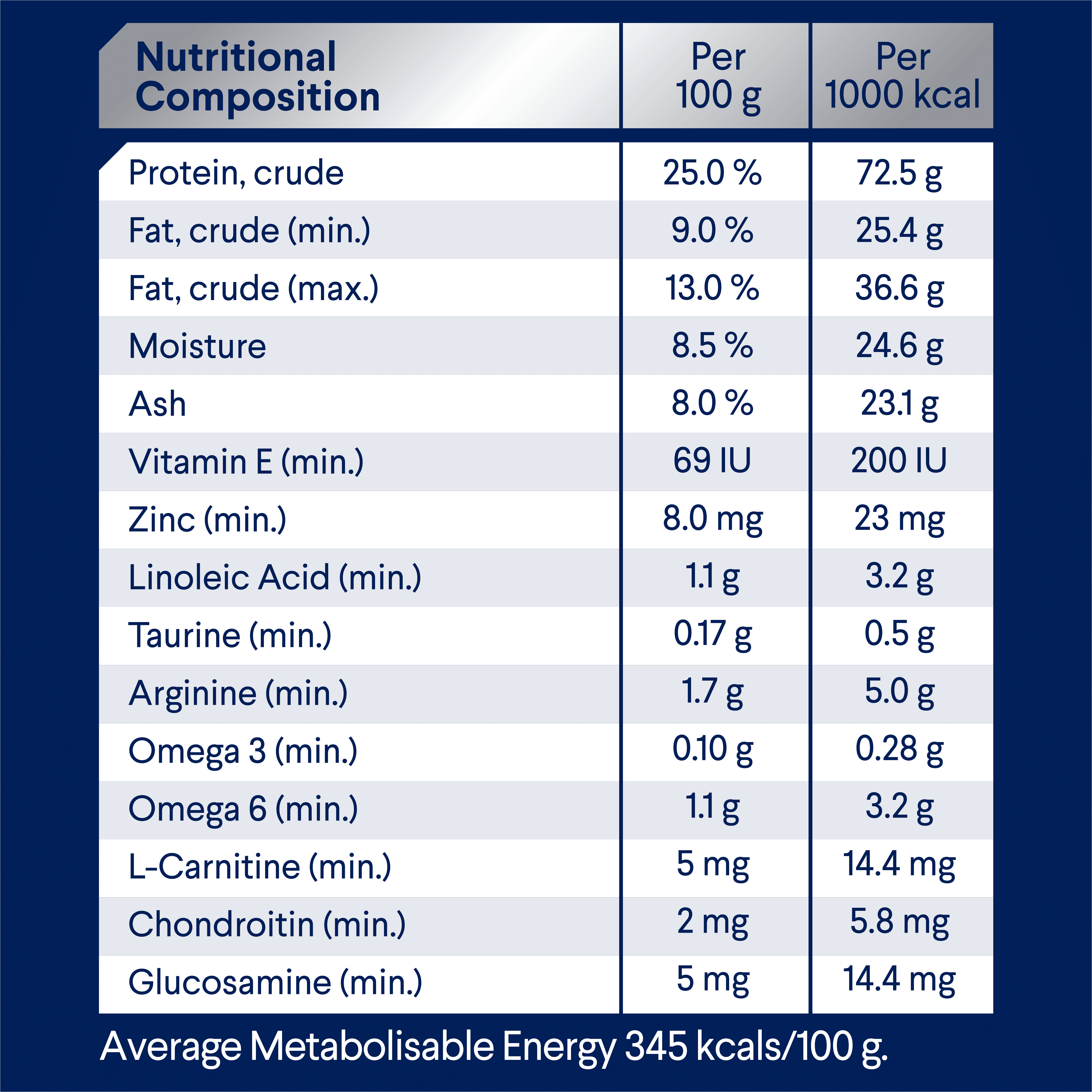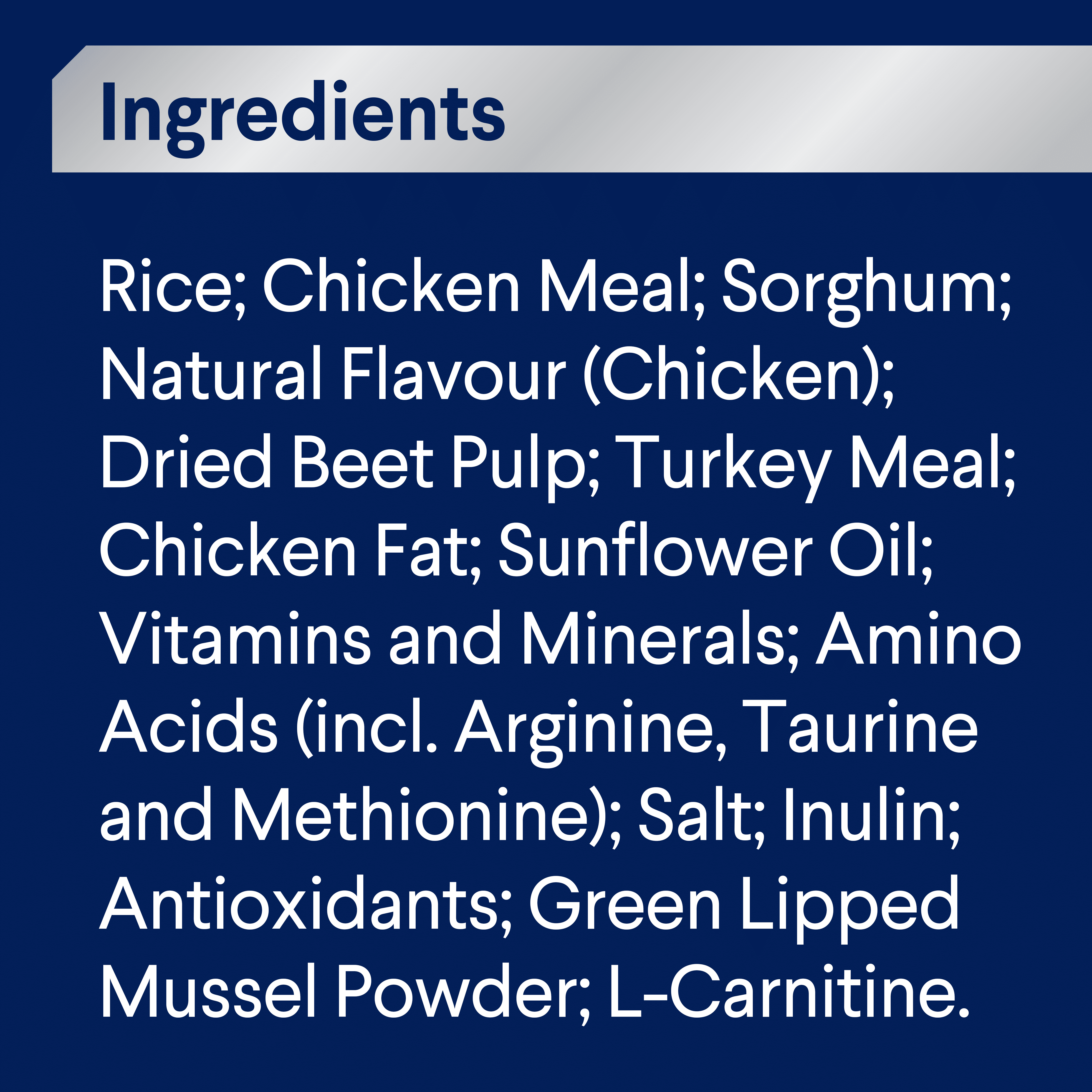 Rice; Chicken Meal; Sorghum; Dried Beet Pulp; Natural Flavour (Chicken); Chicken Fat; Turkey Meal; Sunflower Oil; Vitamins and Minerals; Amino Acids (incl. Arginine, Taurine and Methionine); Salt; Inulin; Antioxidants; Green Lipped Mussel Powder; L-Carnitine.