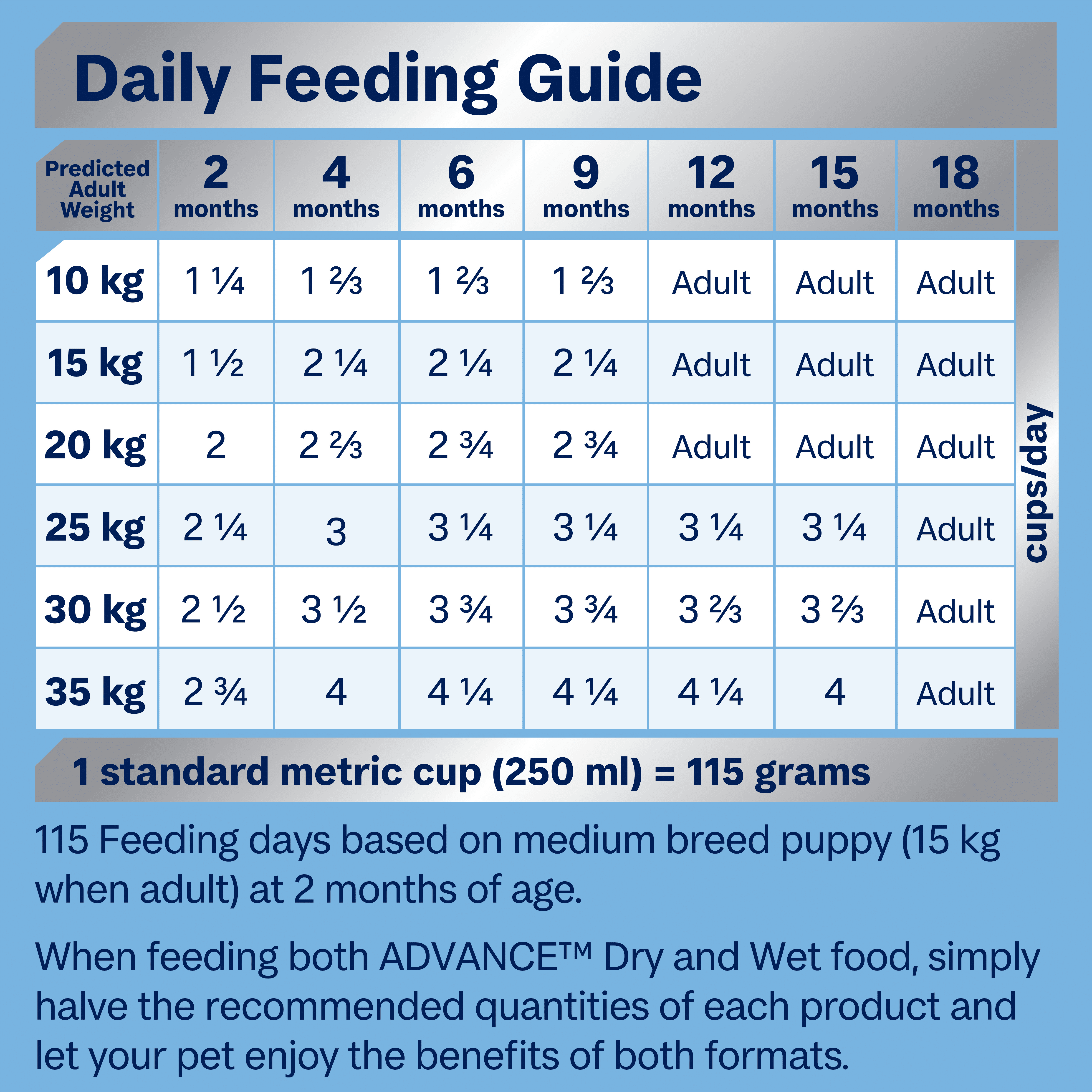 When feeding both ADVANCE™ Dry and Wet food, simply halve the recommended quantities of each product and let your pet enjoy the benefits of both formats.