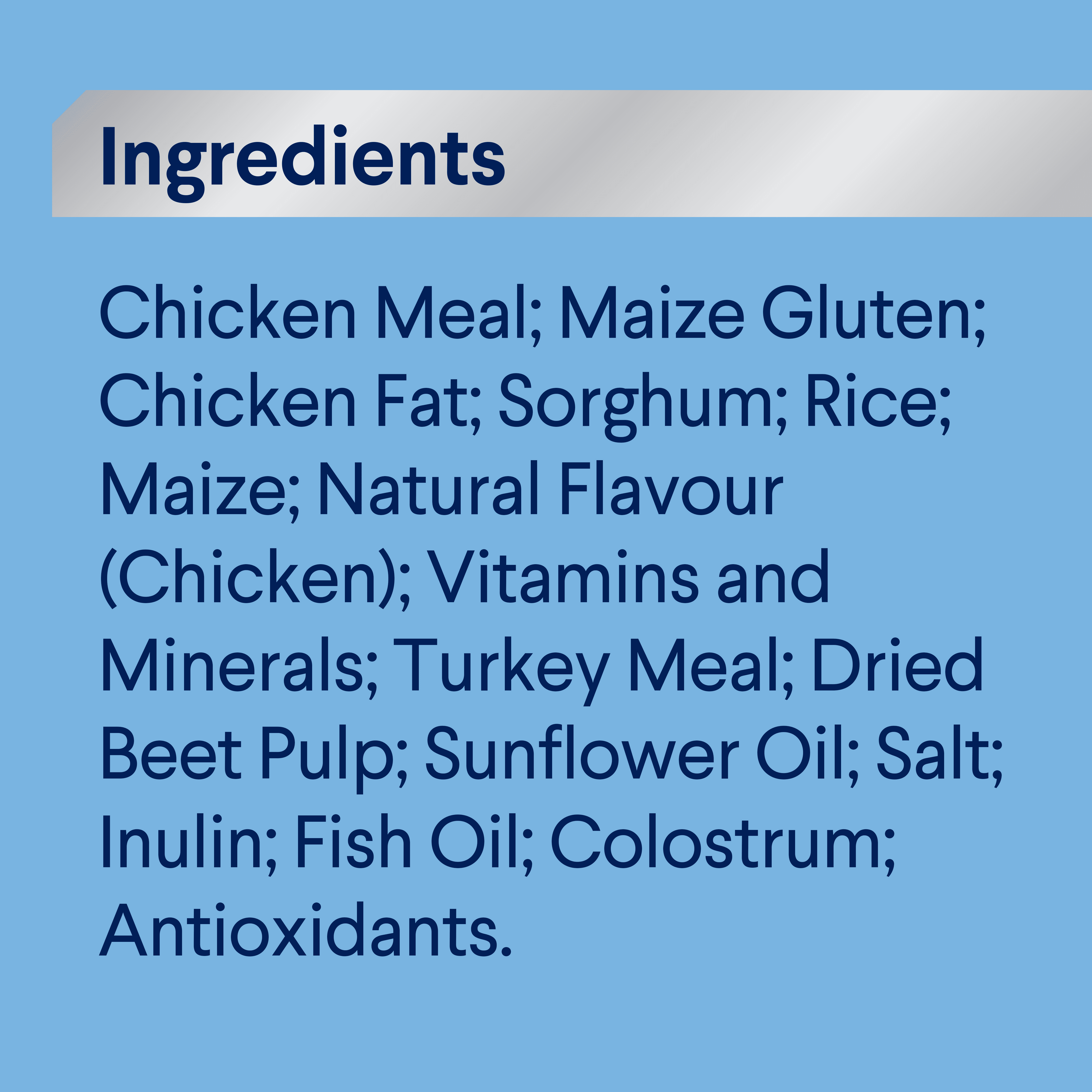Chicken Meal; Maize Gluten; Chicken Fat; Sorghum; Rice; Maize; Natural Flavour (Chicken); Vitamins and Minerals; Dried Beet Pulp; Sunflower Oil; Turkey Meal; Salt; Inulin; Fish Oil; Colostrum; Antioxidants.