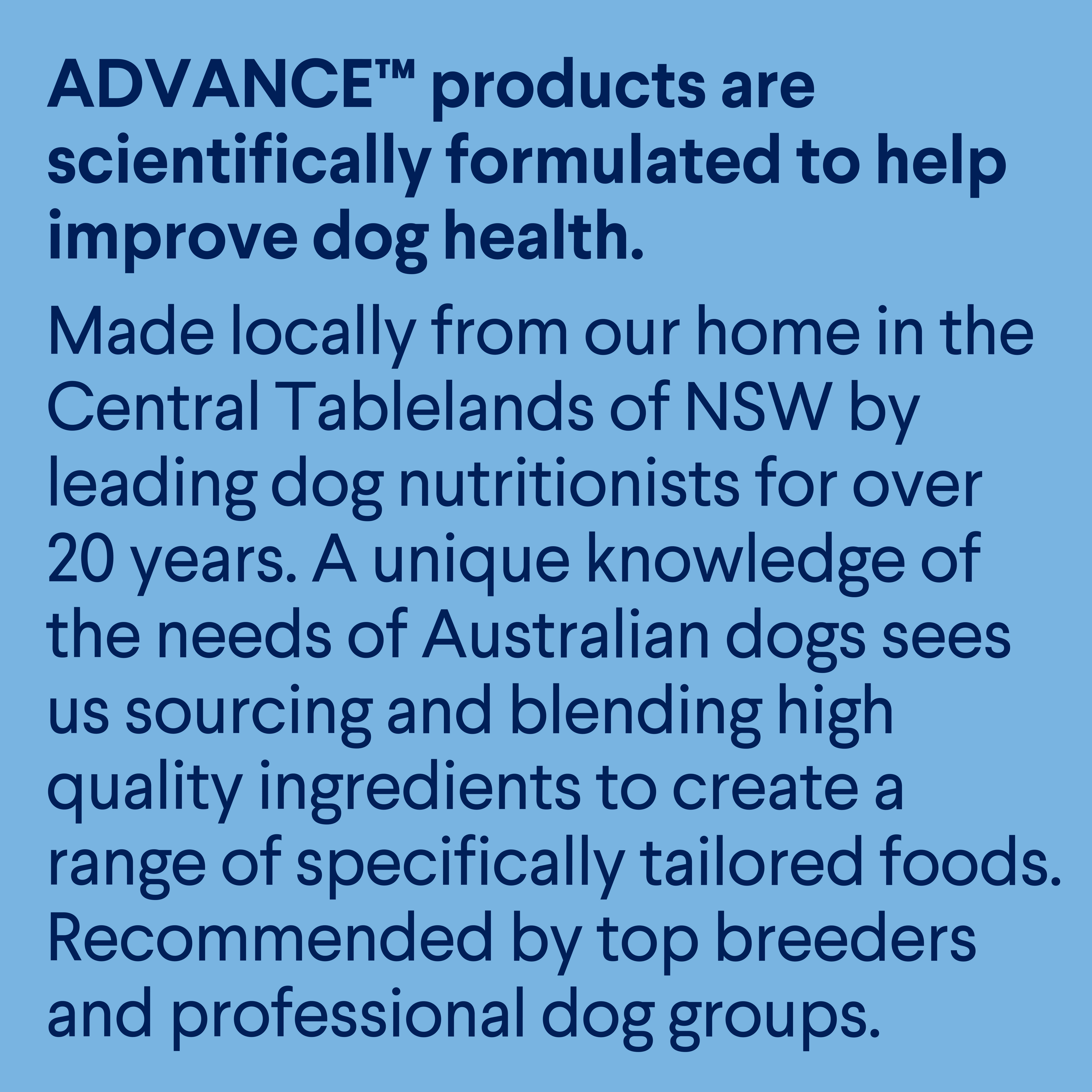 ADVANCE™ products are scientifically formulated to help improve dog health. Made locally from our home in the Central Tablelands of NSW by leading dog nutritionists for over 20 years.