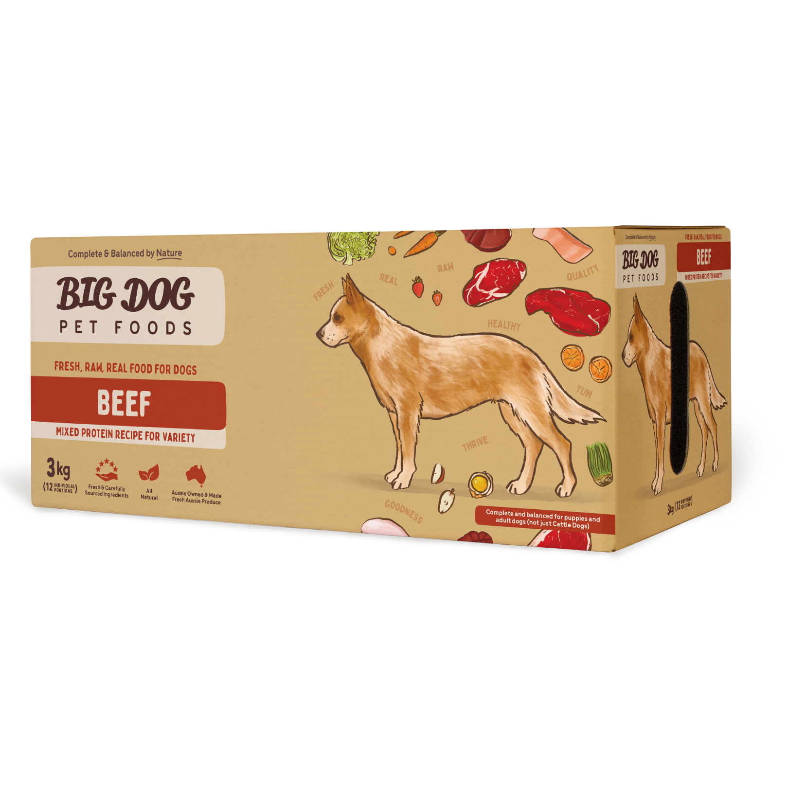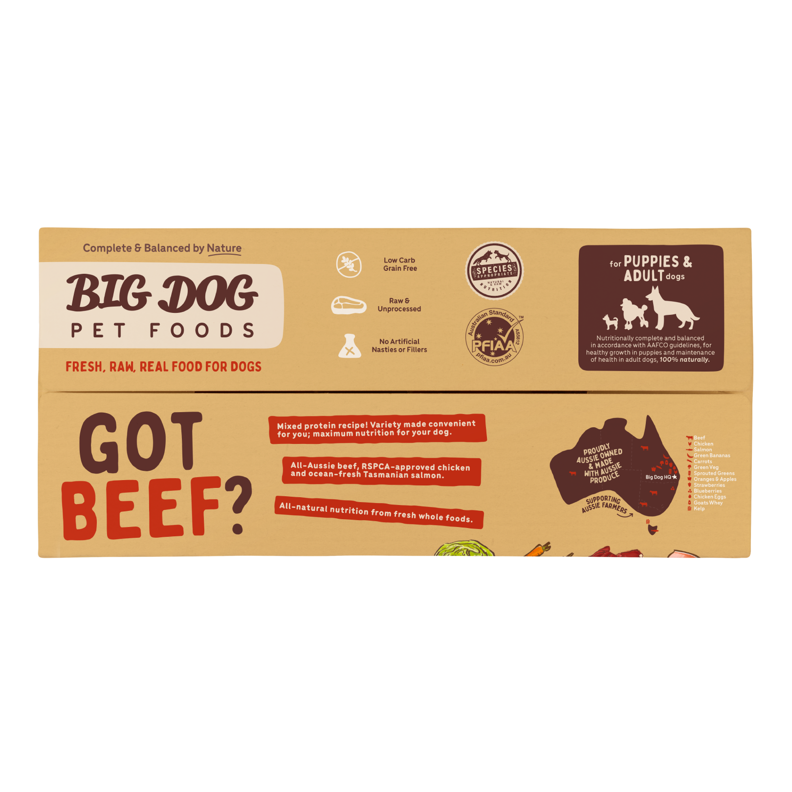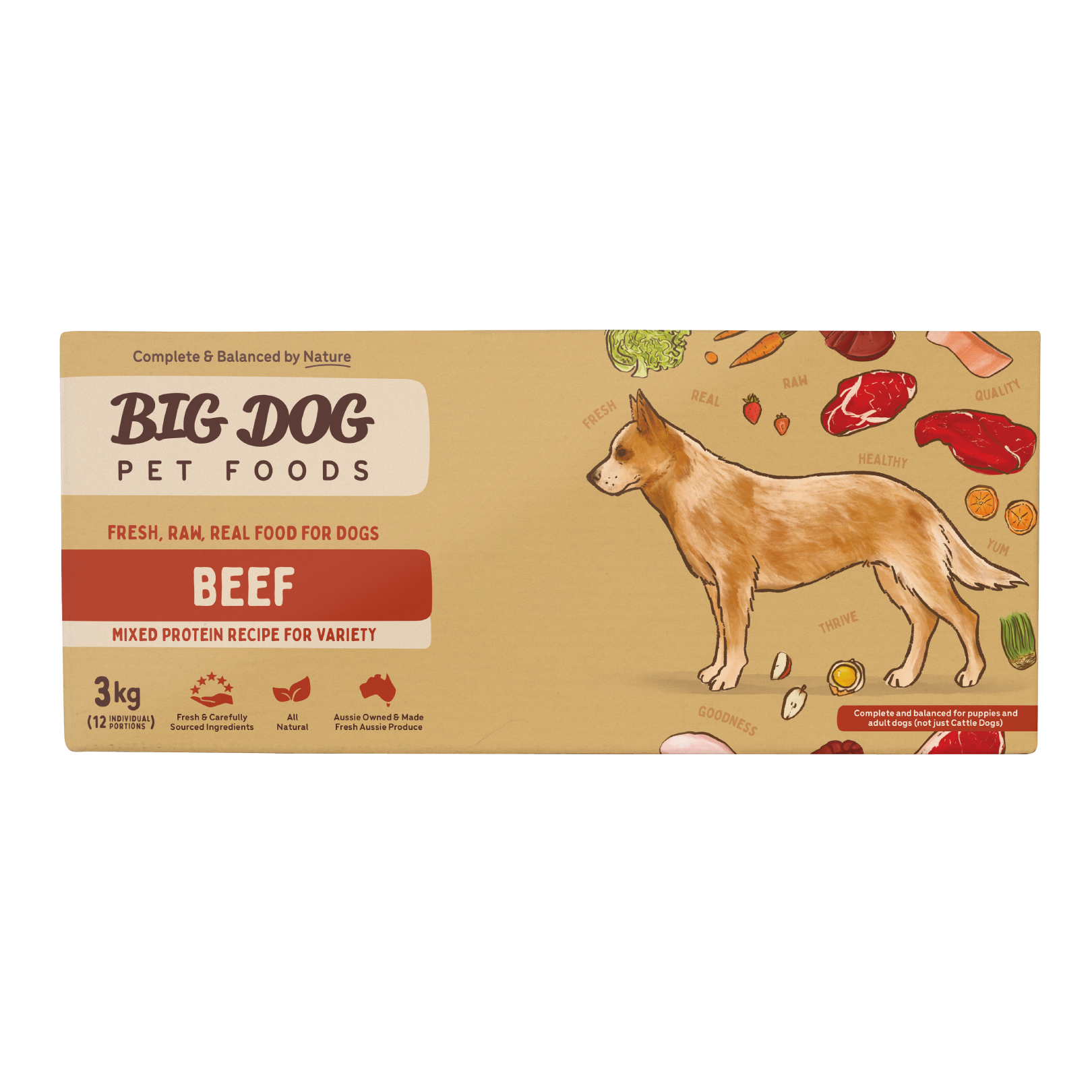 Big Dog Beef is Complete and Balanced by AAFCO standards for healthy growth in puppies and maintaining health in adult dogs.