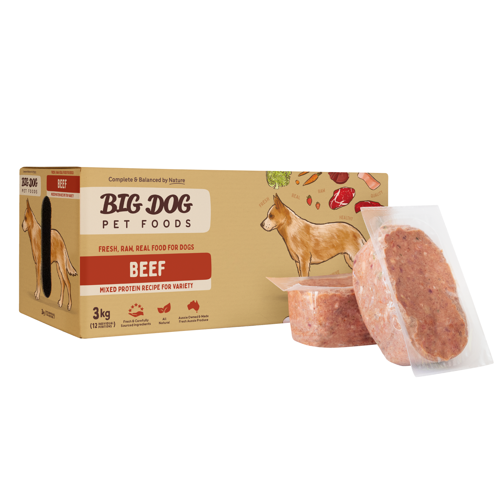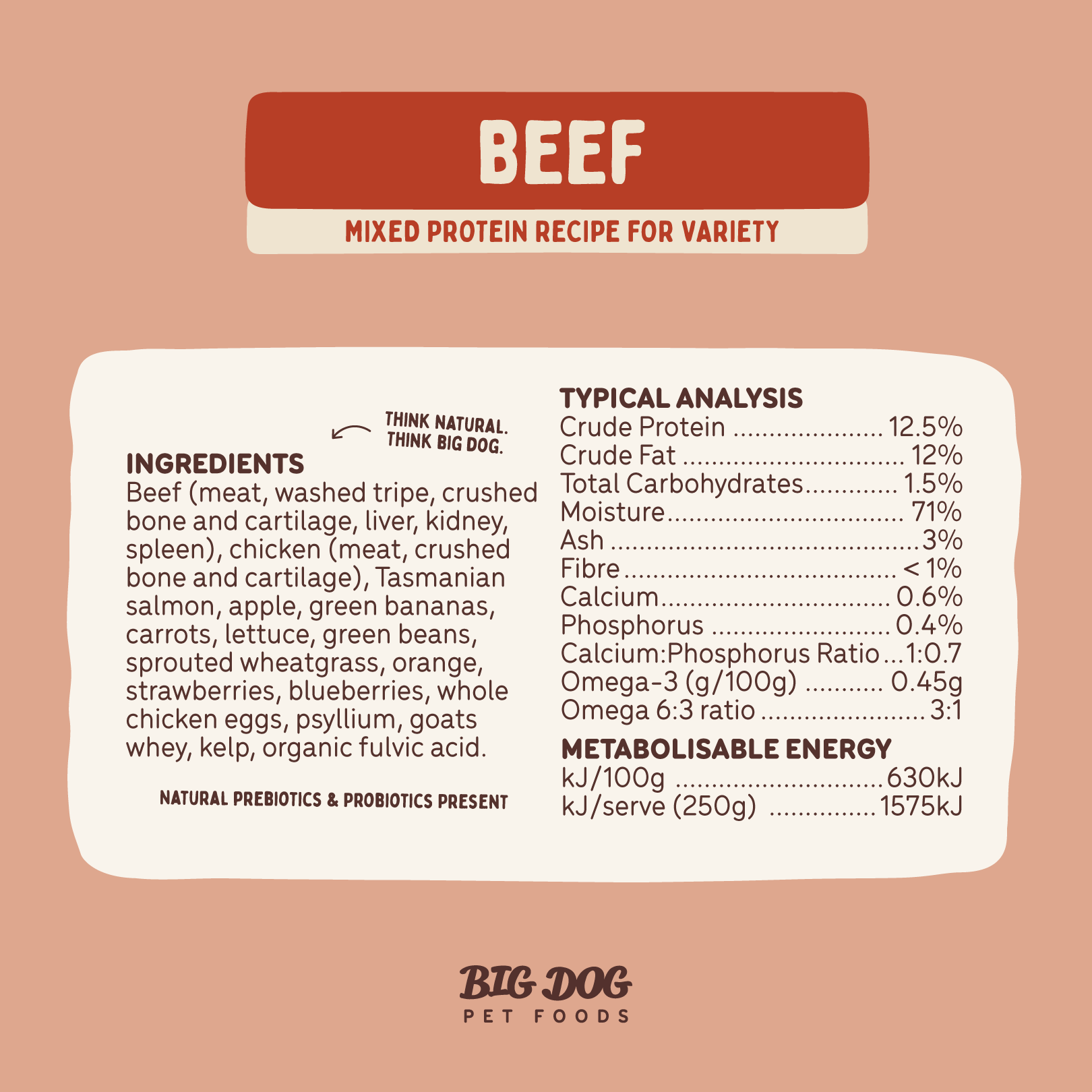 As with all Big Dog diets, muscle meat provides high-quality protein, offal provides a natural source of concentrated vitamins and minerals and crushed bone and cartilage provide naturally occurring calcium and nutrient-dense marrow and collagen. Add to this, our unique blend of fresh fruits and vegetables for vitamins, minerals and antioxidants and you have the perfect biologically appropriate healthy diet for your dog.
