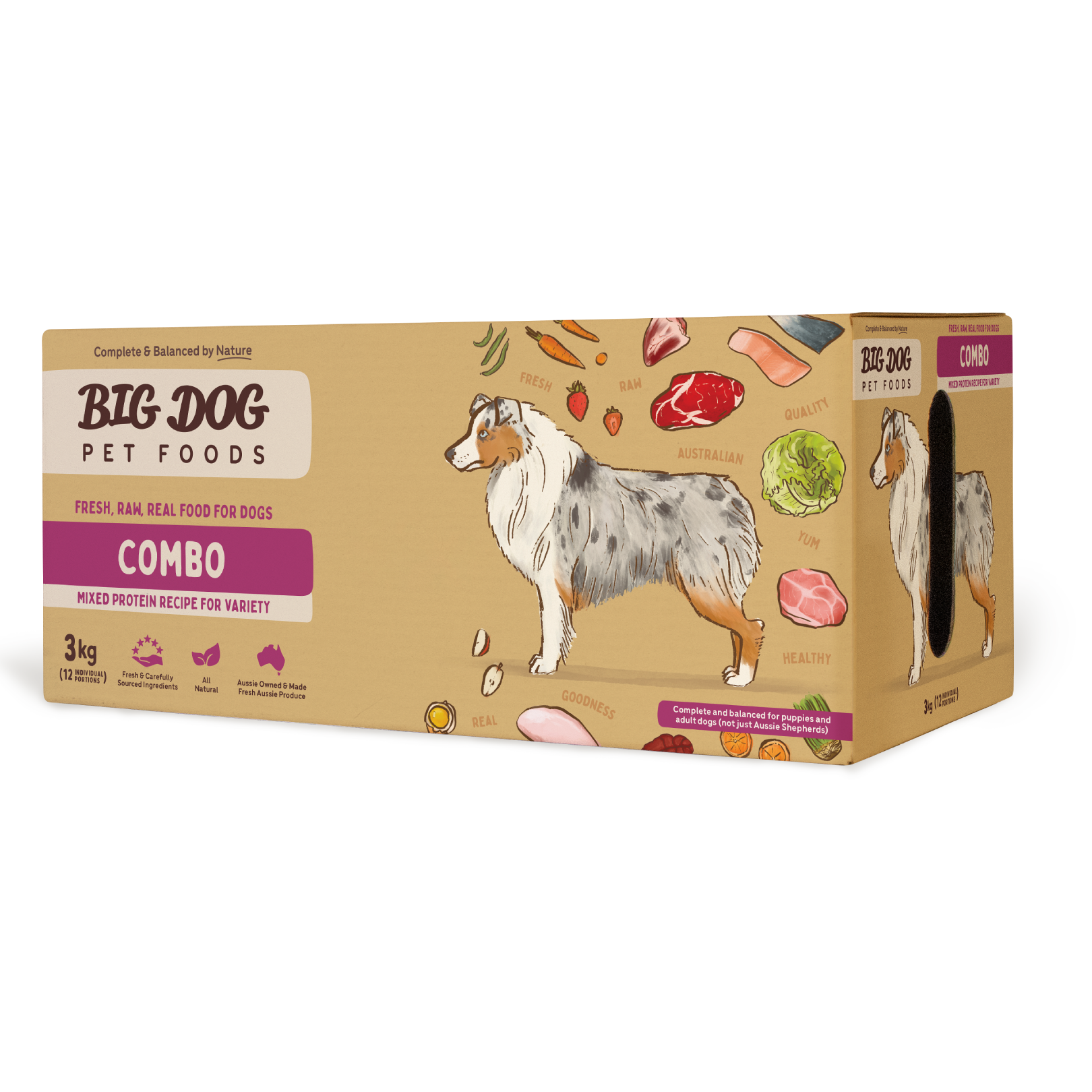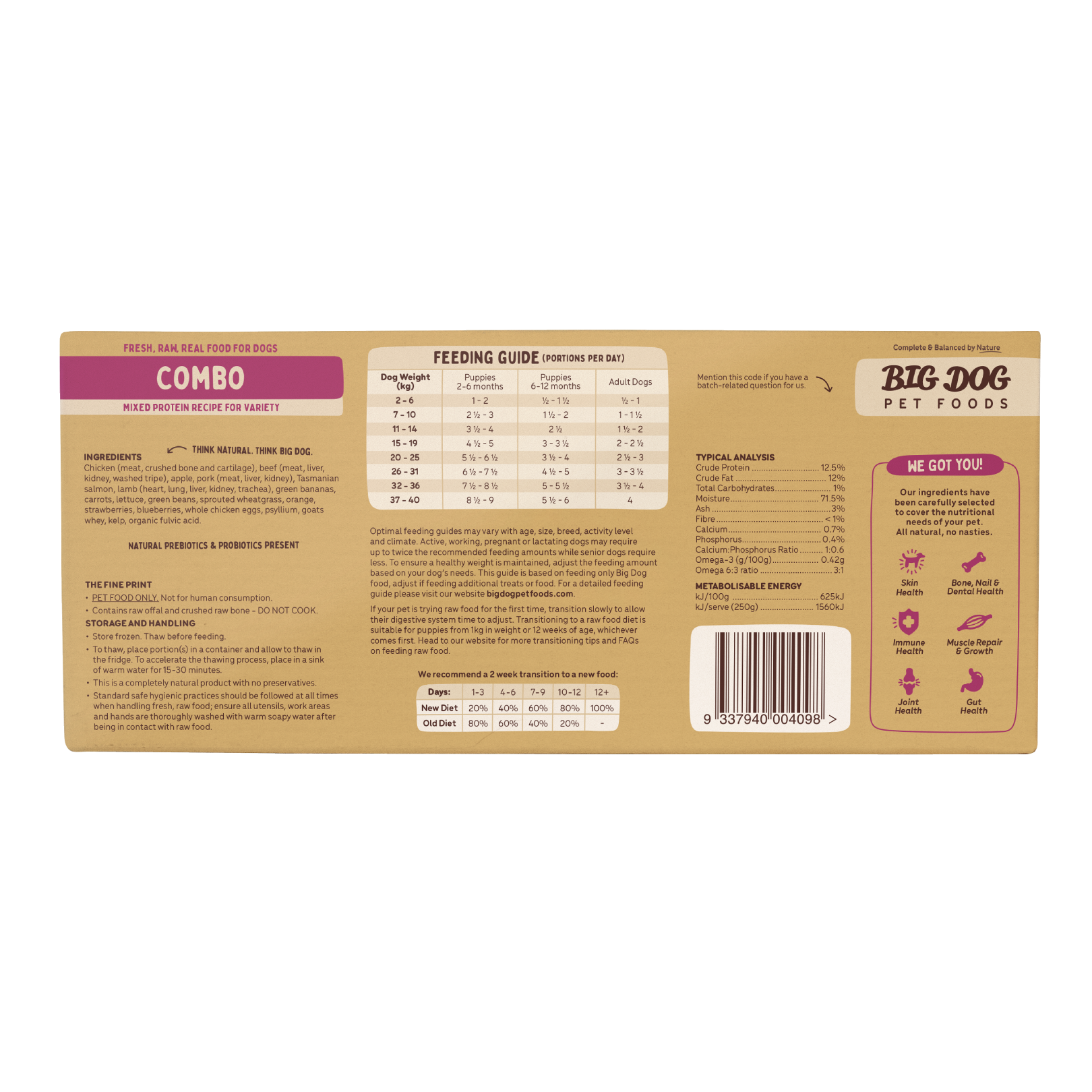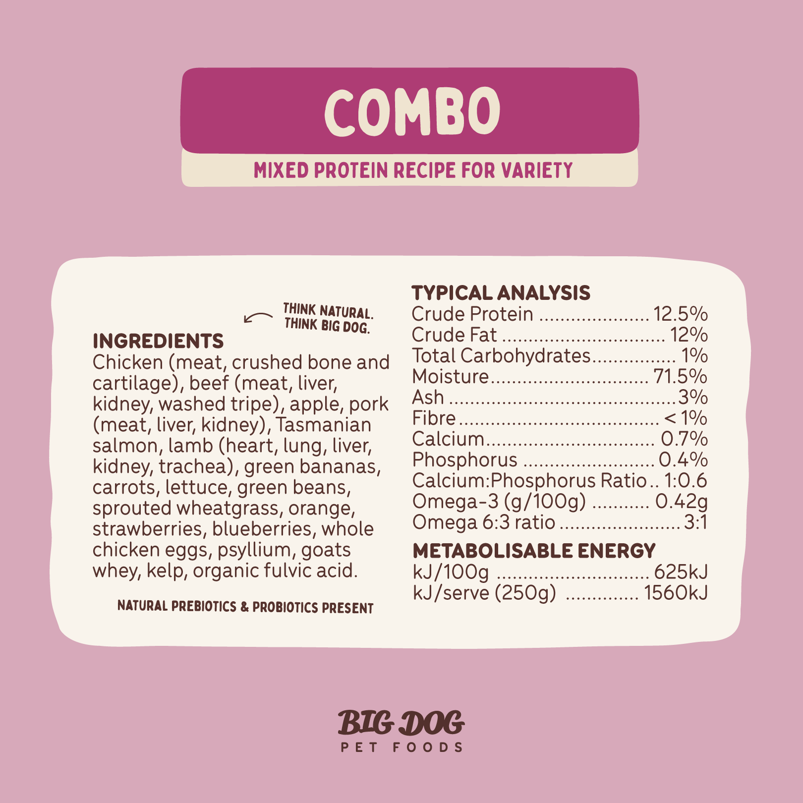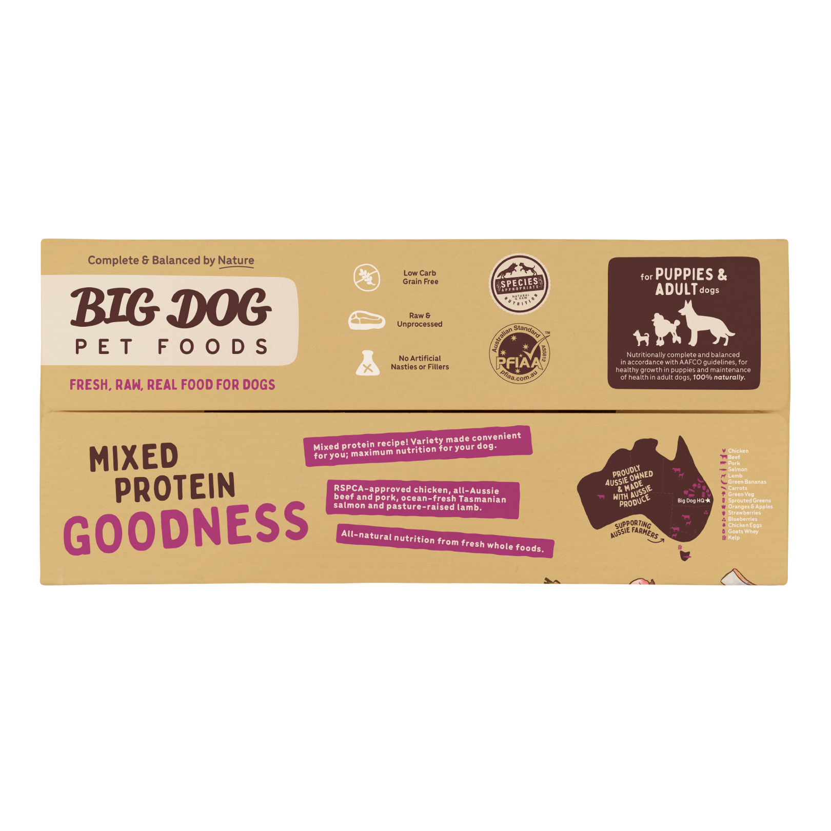 With the addition of Big Dog’s special extra ingredients, including organic fulvic acid, whole eggs, psyllium, goats whey, kelp and sprouted wheatgrass, your dog will be happy and healthy.