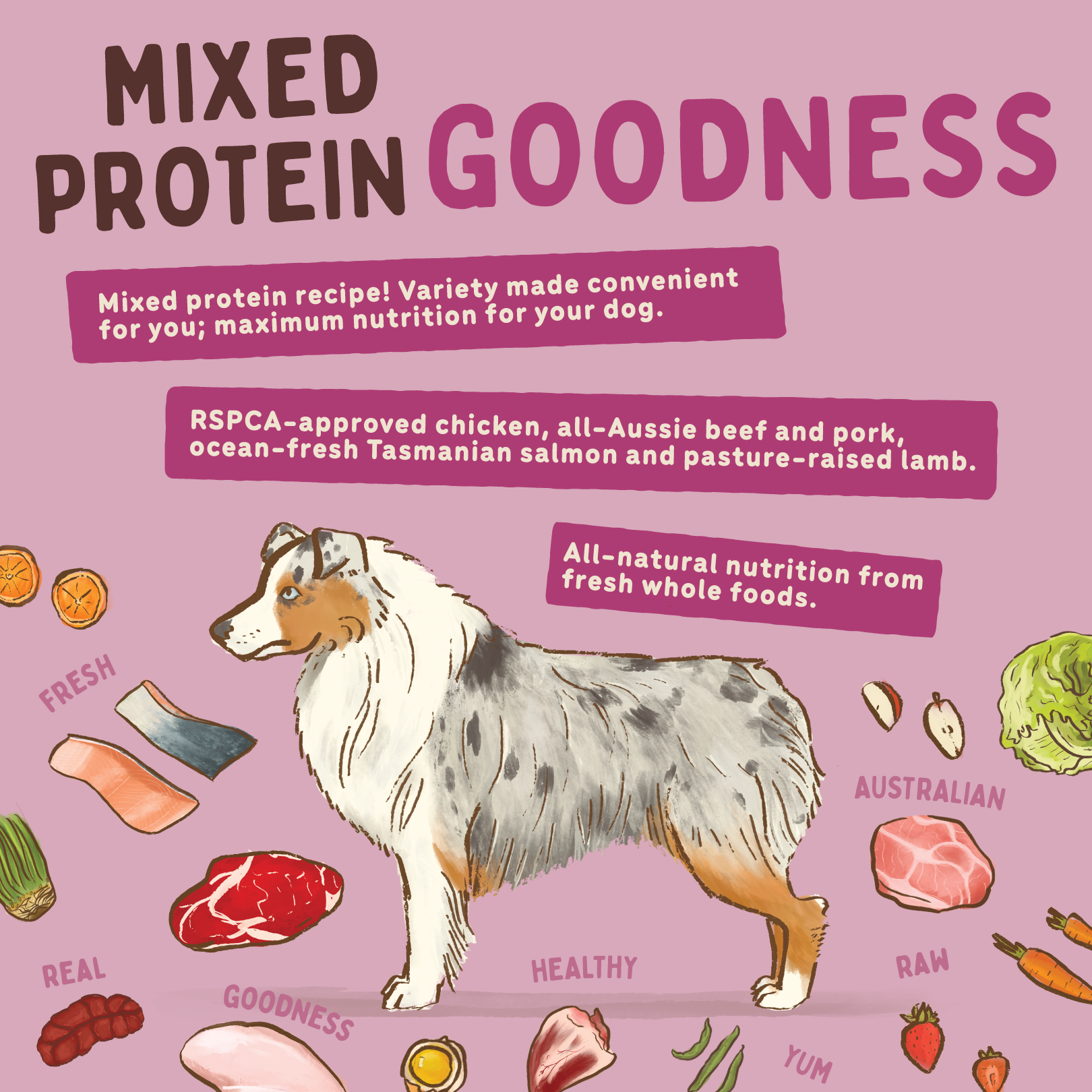 With more tasty forms of protein than your dog could dream of, this combination of high-quality RSPCA-approved chicken, all-Aussie beef and pork, ocean fresh Tasmanian salmon and pasture-raised lamb truly is a mouthful!