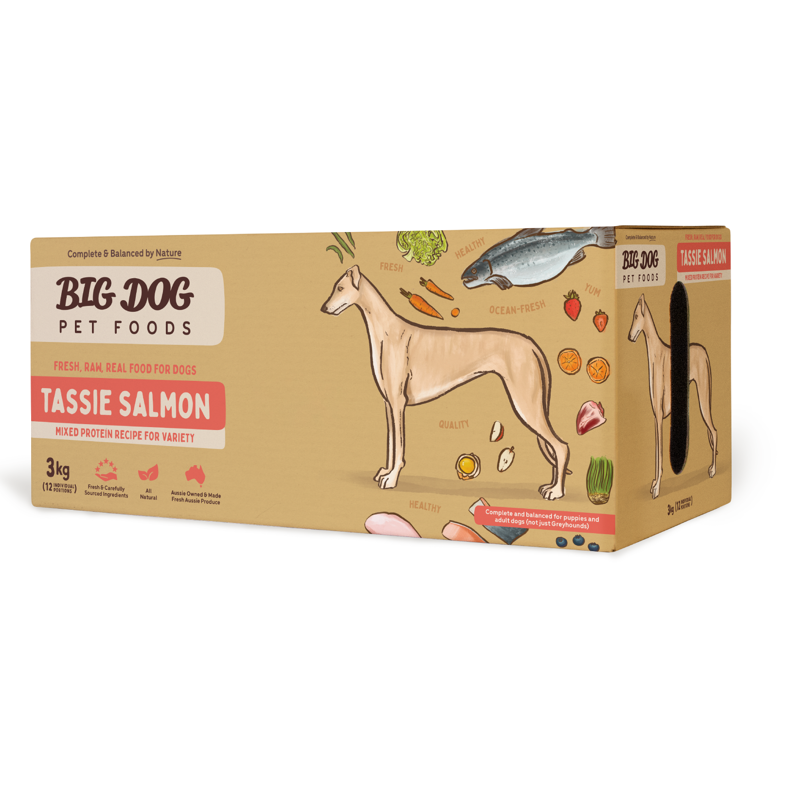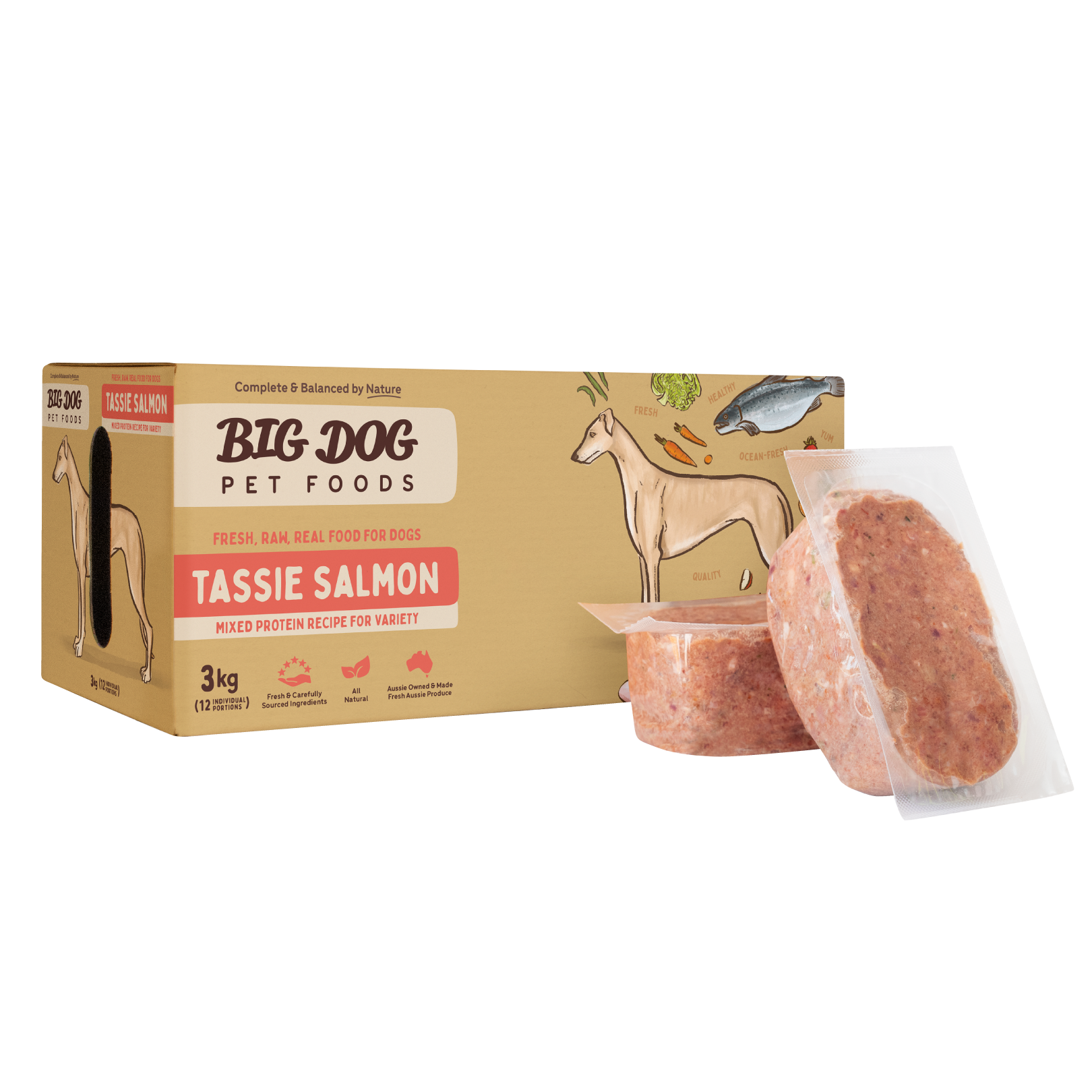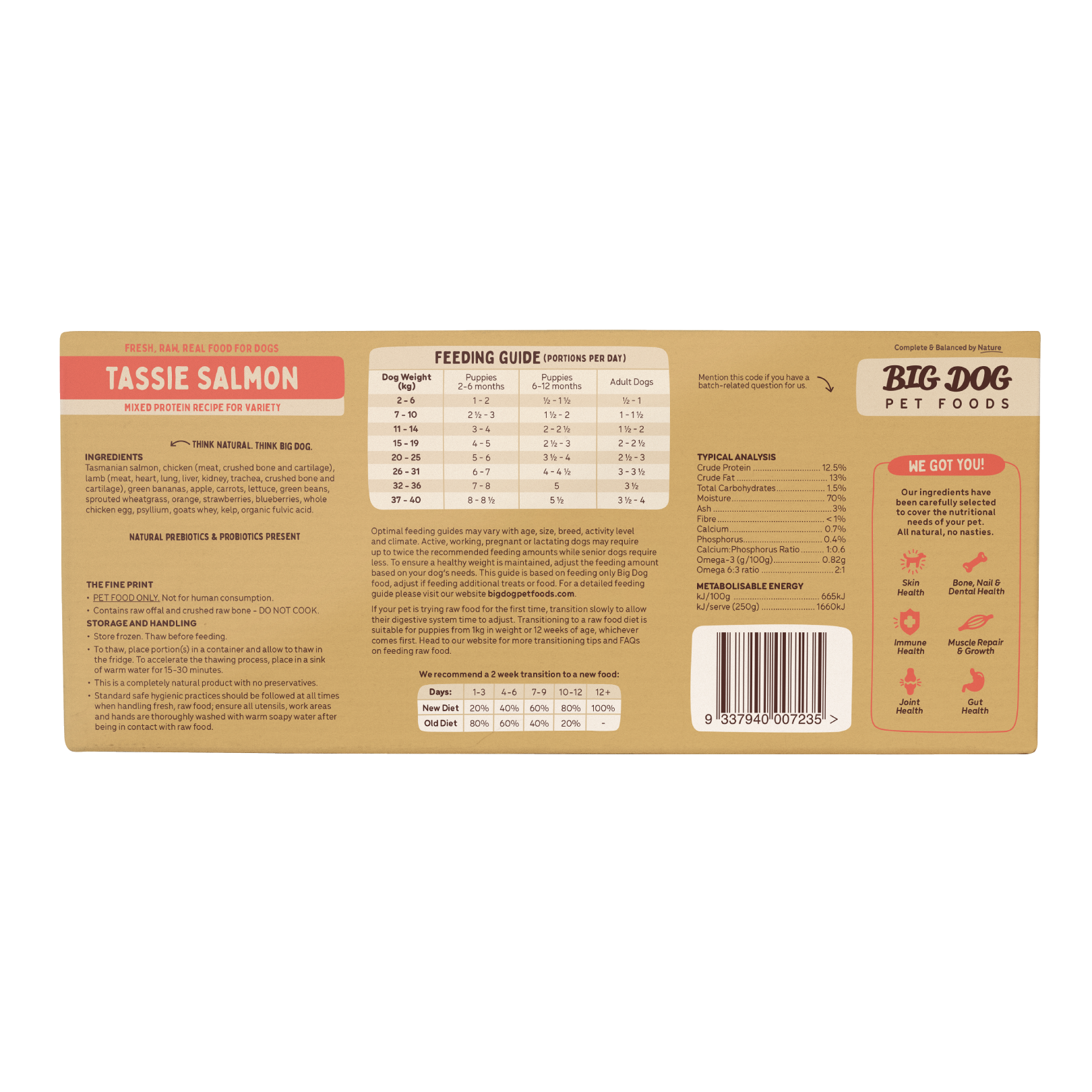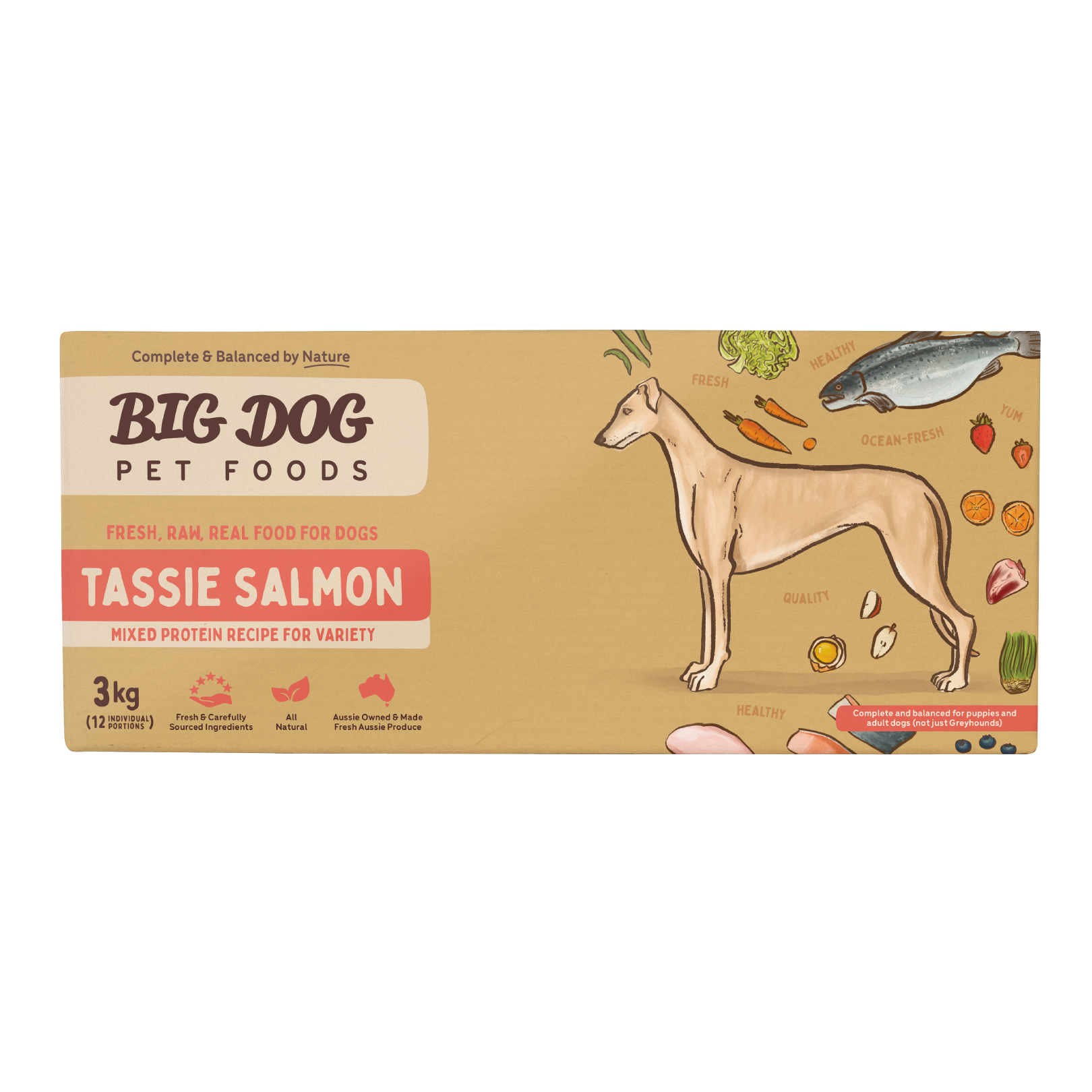 Big Dog Tassie Salmon is Complete and Balanced by AAFCO standards for healthy growth in puppies and maintaining health in adult dogs