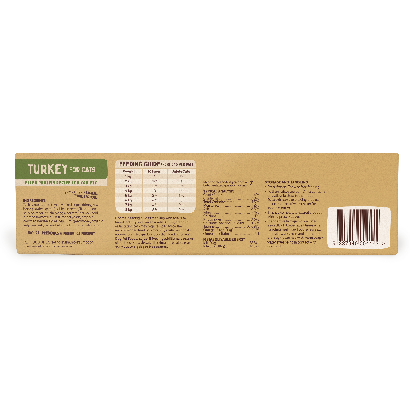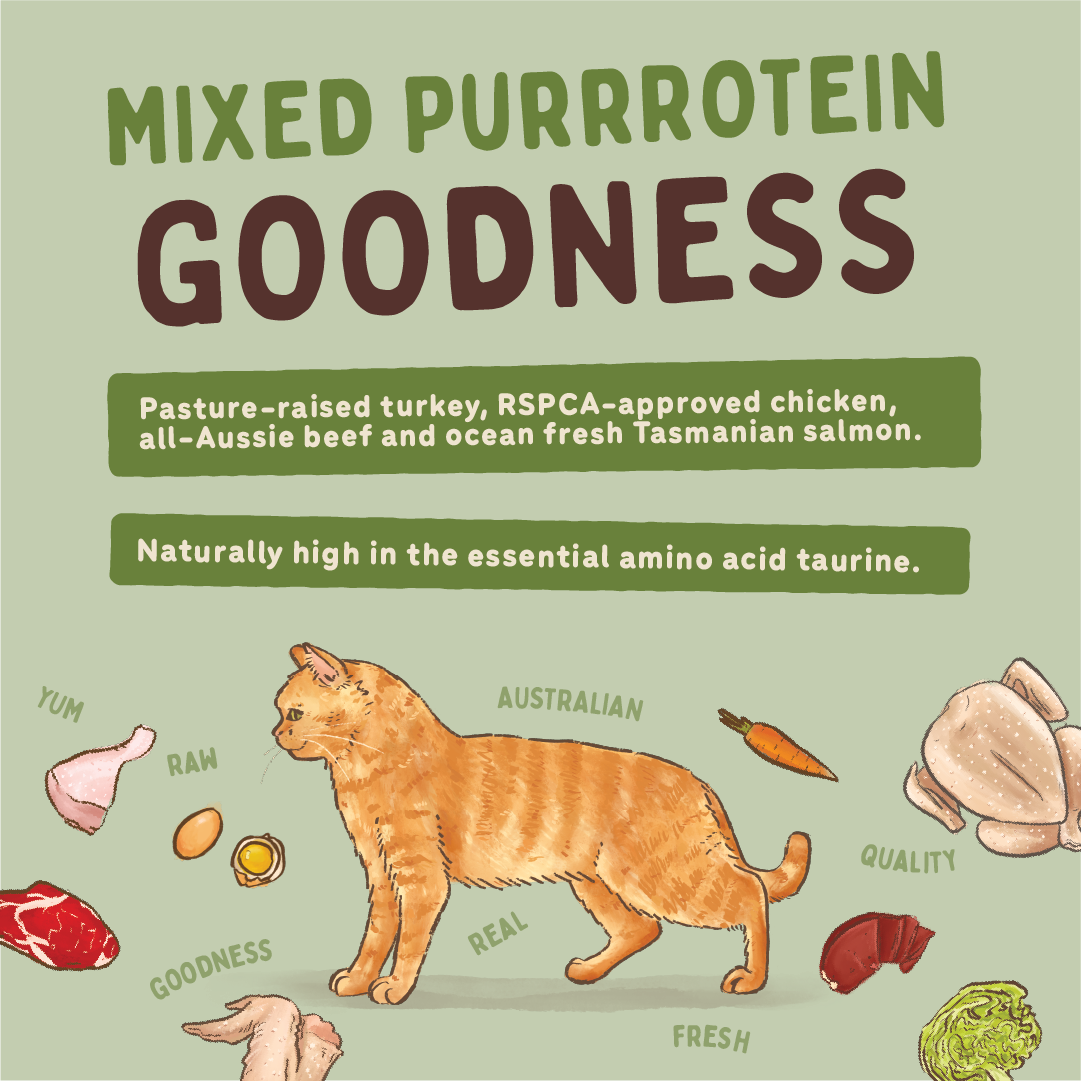 For a lighter flavour, your cat may prefer our Turkey recipe. This recipe features turkey as the primary protein, along with chicken, beef and Tasmania salmon for nutritional variety. To this, we add biologically appropriate amounts of vegetables, whole eggs and kelp, along with vitamin and mineral-rich offal, calcium-rich raw bone powder.