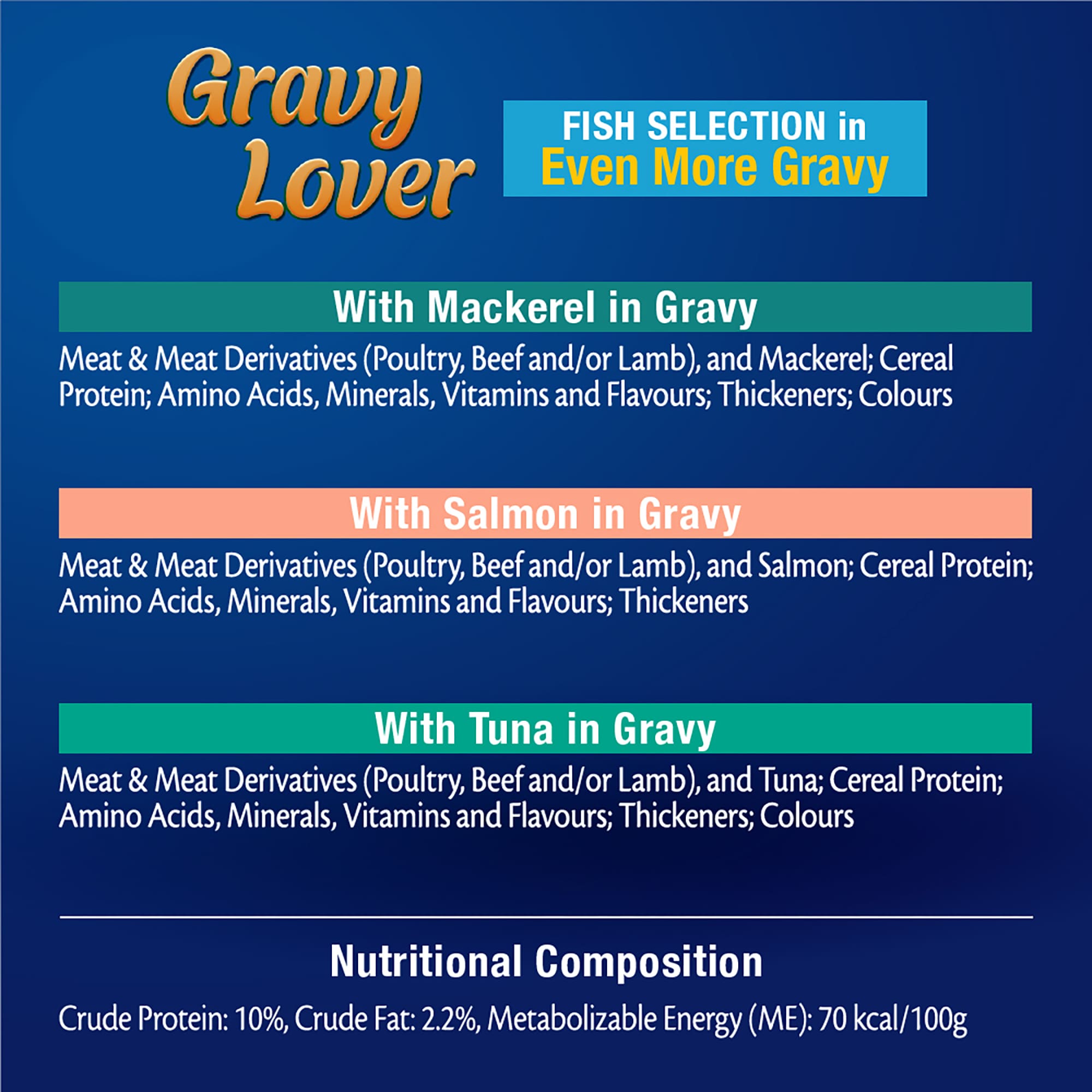 Not only do these recipes provide a playful and delicious experience, but they also offer complete and balanced nutrition for your adult cat. Packed with essential vitamins, minerals, and proteins, our Adult As Good as it Looks Gravy Lover Fish Selection supports their overall health and well-being. You can feel confident knowing that you're providing your cat with a meal that is both enjoyable and nutritious, with the added bonus of the irresistible gravy they love.