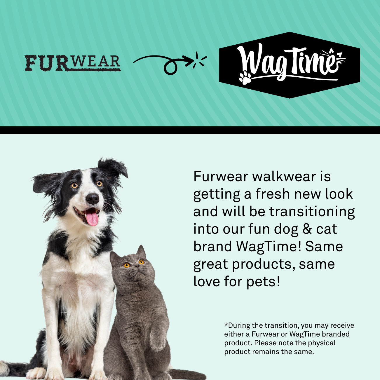During the transition, you may receive either a Furwear or WagTime branded product. Please note the physical product remains the same.
