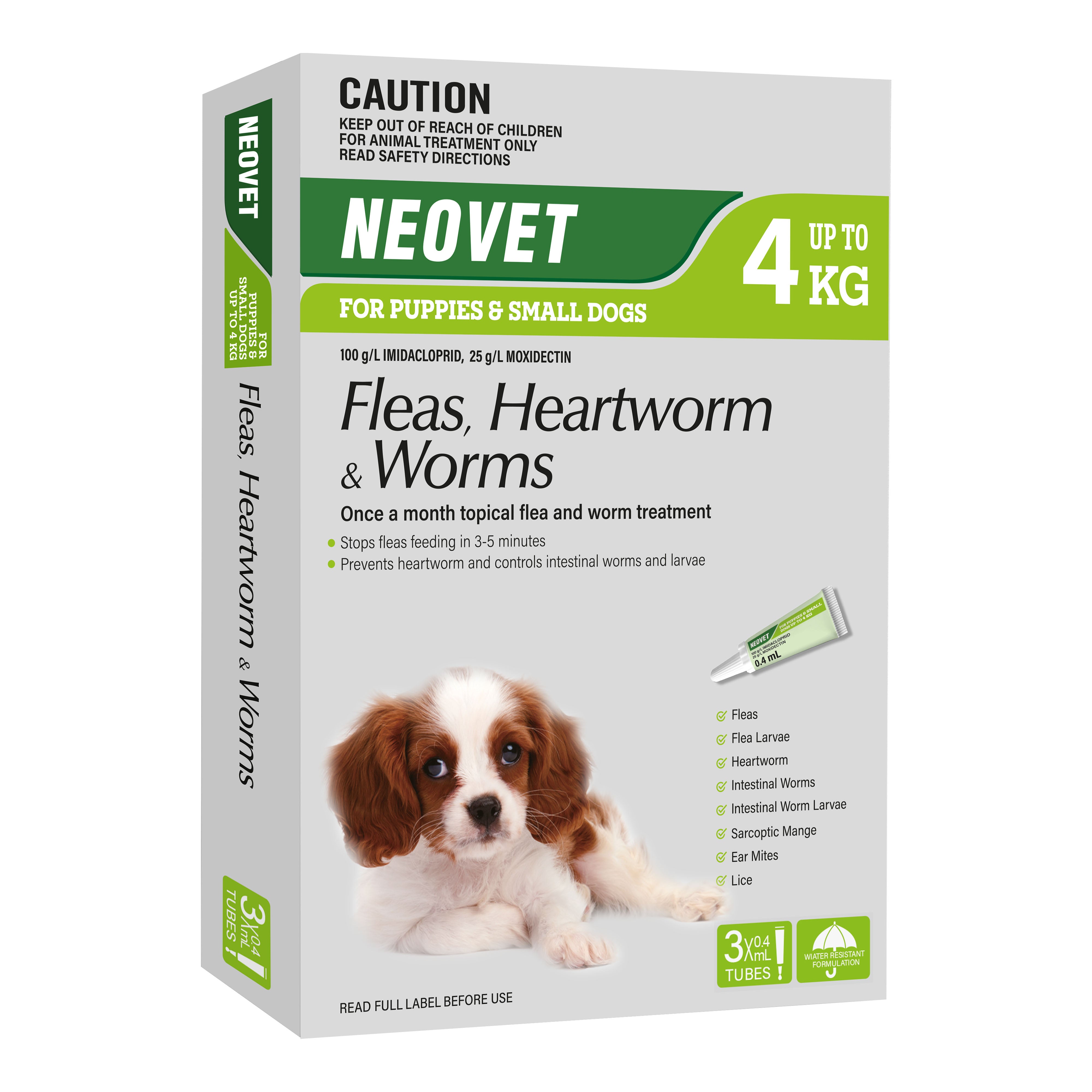 NEOVET for Small Dogs and Puppies under 4kg will protect your dog from heartworm, intestinal worms, ear mites, mange mite,... Read more