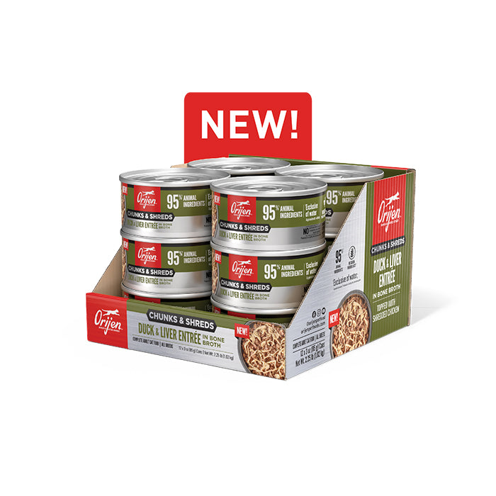 Nourish your cat with the texture and variety of raw animal ingredients packed into every can of ORIJEN™ Chunks & Shreds.
