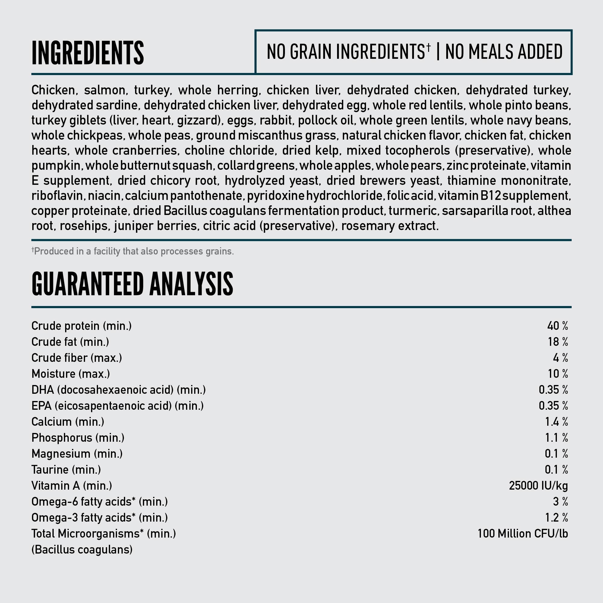 Chicken, salmon, turkey, whole herring, chicken liver, dehydrated chicken, dehydrated turkey, dehydrated sardine, dehydrated chicken liver, dehydrated egg, whole red lentils, whole pinto beans, turkey giblets (liver, heart, gizzard), eggs, rabbit, pollock oil, whole green lentils, whole navy beans, whole chickpeas, whole peas, ground miscanthus grass, natural chicken flavour, chicken fat, chicken hearts, whole cranberries, choline chloride, dried kelp, mixed tocopherols (preservative), whole pumpkin, whole butternut squash, collard greens, whole apples, whole pears, zinc proteinate, vitamin E supplement, dried chicory root, hydrolysed yeast, dried brewers yeast, thiamine mononitrate, riboflavin, niacin, calcium pantothenate, pyridoxine hydrochloride, folic acid, vitamin B12 supplement, copper proteinate, dried Bacillus coagulans fermentation product, turmeric, sarsaparilla root, althea root, rosehips, juniper berries, citric acid (preservative), rosemary extract.