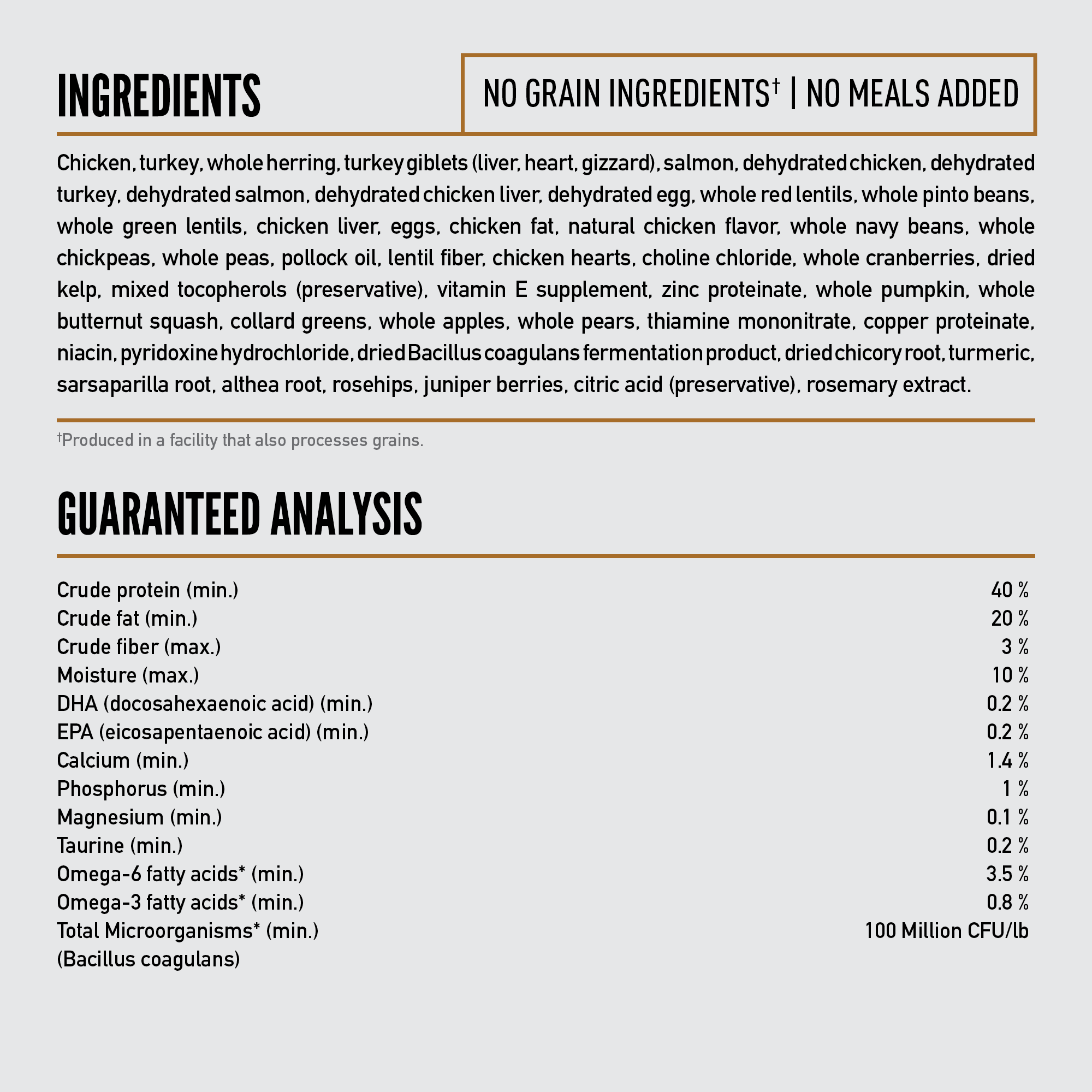 Chicken, turkey, whole herring, turkey giblets (liver, heart, gizzard), salmon, dehydrated chicken, dehydrated turkey, dehydrated salmon, dehydrated chicken liver, dehydrated egg, whole red lentils, whole pinto beans, whole green lentils, chicken liver, eggs, chicken fat, natural chicken flavour, whole navy beans, whole chickpeas, whole peas, pollock oil, lentil fibre, chicken hearts, choline chloride, whole cranberries, dried kelp, mixed tocopherols (preservative), vitamin E supplement, zinc proteinate, whole pumpkin, whole butternut squash, collard greens, whole apples, whole pears, thiamine mononitrate, copper proteinate, niacin, pyridoxine hydrochloride, dried Bacillus coagulans fermentation product, dried chicory root, turmeric, sarsaparilla root, althea root, rosehips, juniper berries, citric acid (preservative), rosemary extract.