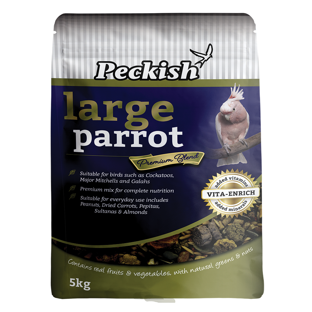 Peckish Large Parrot is a premium blend of all-natural micro-pellets containing real vegetables and greens, dried fruits and vegetables, and nuts with the traditional seeds that birds love for added variety and to meet the nutritional requirements of Cockatoos, Major Mitchells and Galahs.