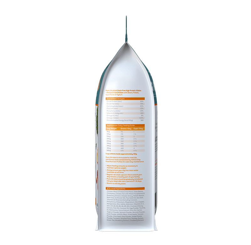 This has been done by carefully crafting the meals using 100% premium cuts of real meat that is freeze dried to retain nutritional value and preserve all the flavours better than other methods. In addition, Pure Life’s premium quality kibble is packed with high protein, with the goodness of superfoods and vegetables for a complete meal..