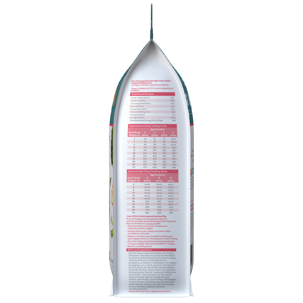 Pure Life Natural Boost Puppy Salmon is a complete meal made of freeze-dried 100% real meat and high-protein kibble. It is single-animal protein, grain-free, high-protein for puppy growth, increased calcium, and enriched with superfoods. Australian made and owned.