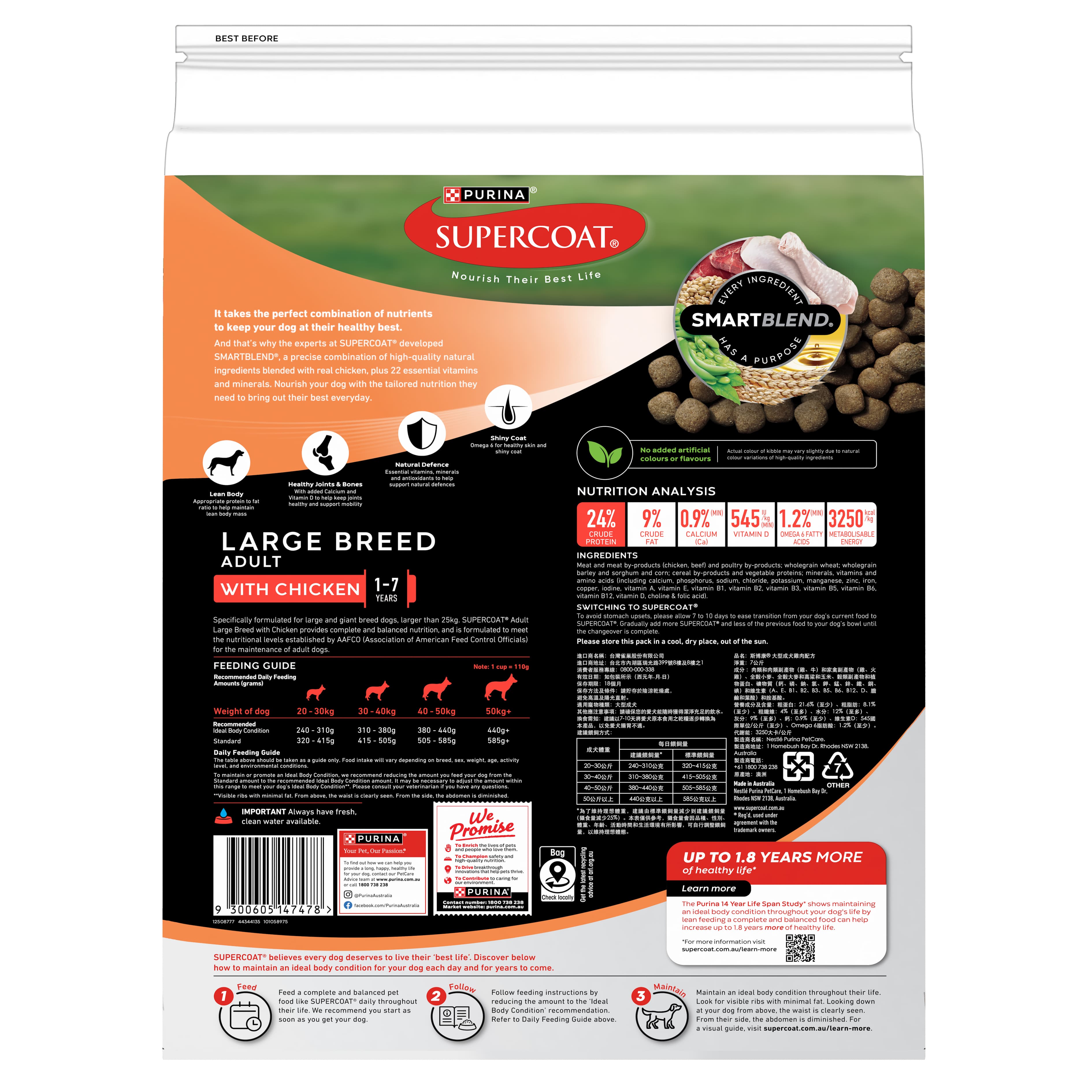 It takes the perfect combination of nutrients to keep your dog at their healthy best. And that's why the experts at SUPERCOAT® developed SMARTBLEND®, a precise combination of high-quality natural ingredients blended with real chicken, plus 22 essential vitamins and minerals. Nourish your dog with the tailored nutrition they need to bring out their best everyday.