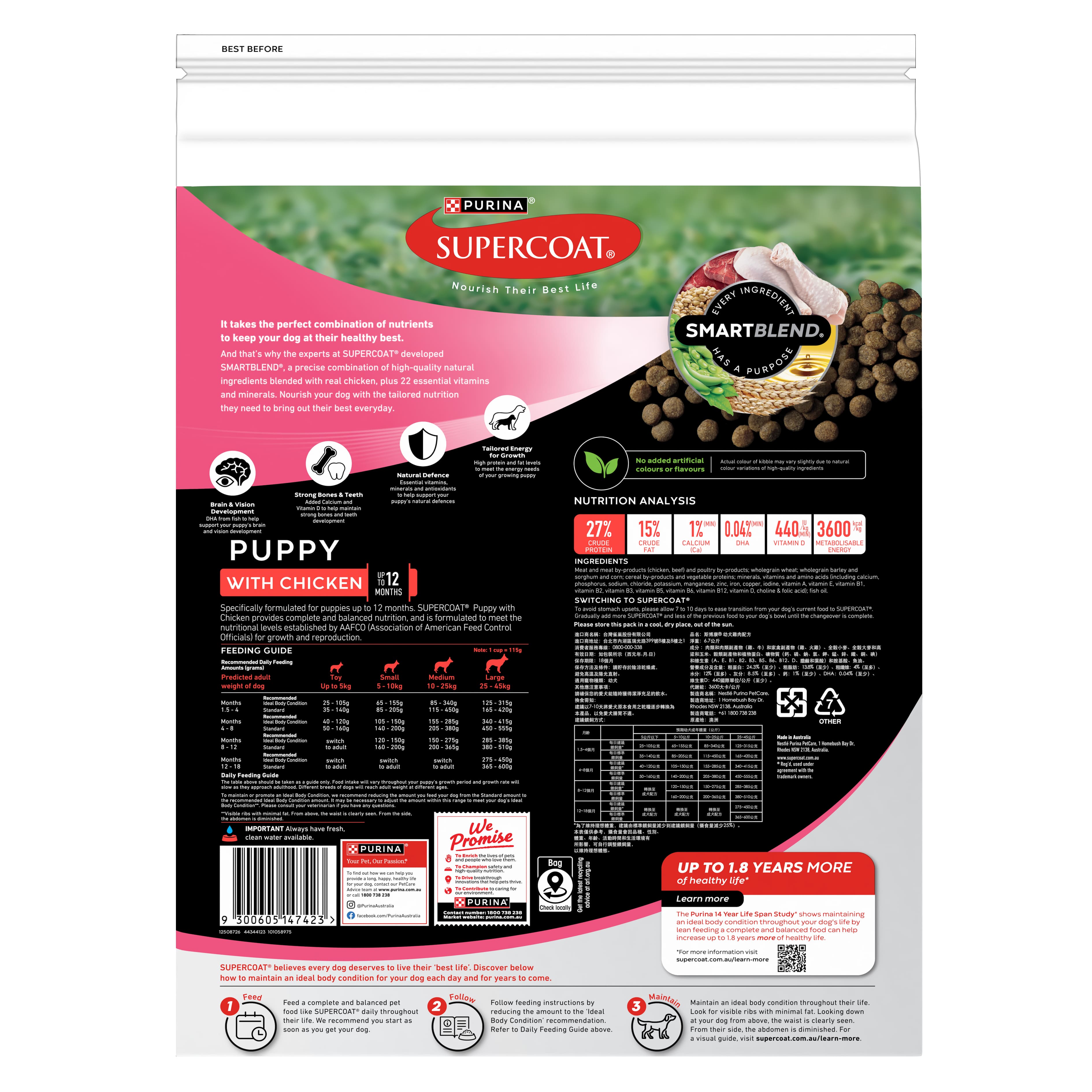 It takes the perfect combination of nutrients to keep your dog at their healthy best. And that's why the experts at SUPERCOAT® developed SMARTBLEND®, a precise combination of high-quality natural ingredients blended with real chicken, plus 22 essential vitamins and minerals. Nourish your dog with the tailored nutrition they need to bring out their best everyday.