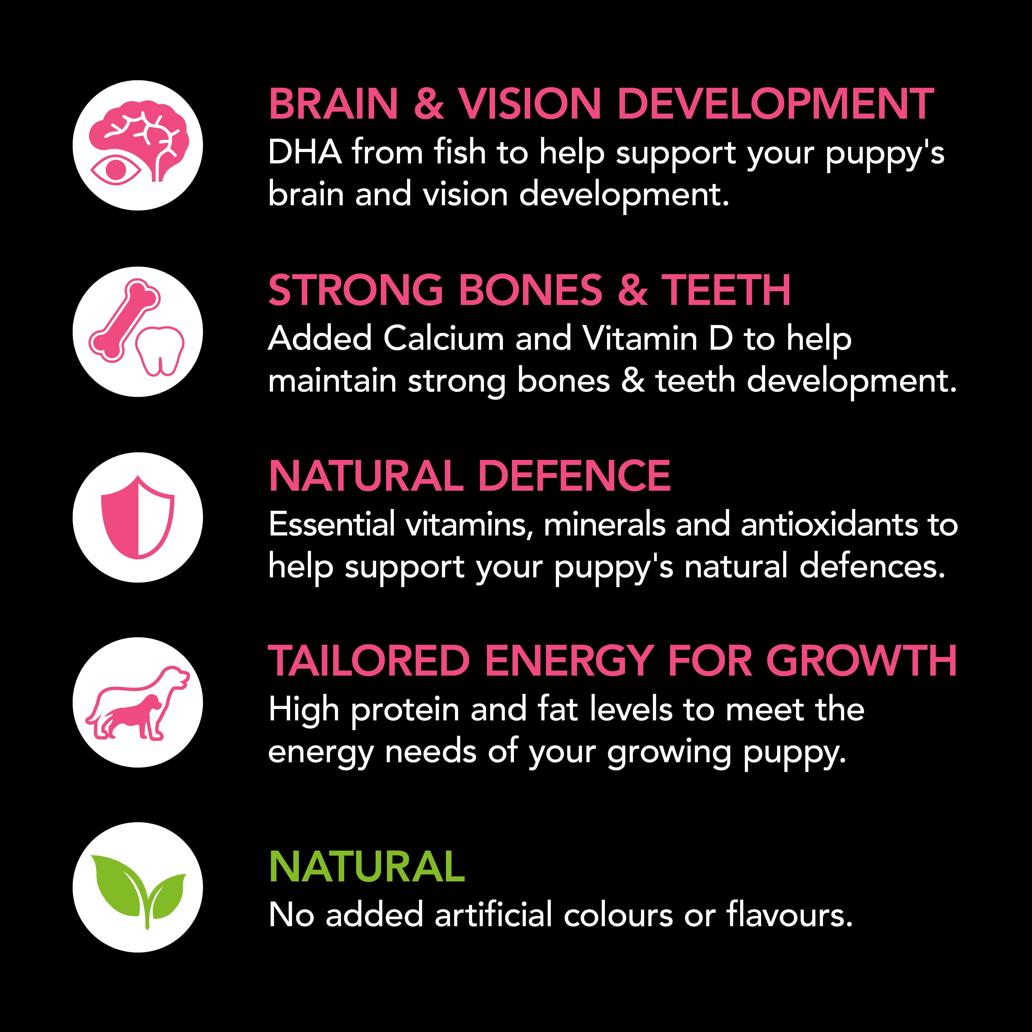 • Natural Defence - Essential vitamins, minerals and antioxidants to help support your puppy's natural defences