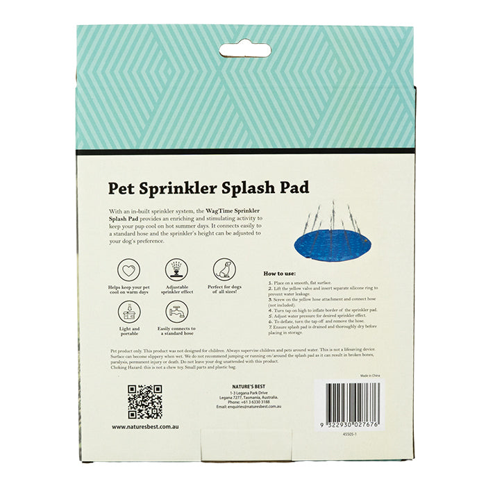 With an in-built sprinkler system, the WagTime Sprinkler Splash Pad provides an enriching and stimulating activity to keep your pup cool on hot summer days. The sprinkler height can be adjusted to your dog’s preference. Made from durable plastic and designed to be light and portable for convenient storage or travel. Measuring a diameter of 90cm, it is suitable for dogs of all sizes and breeds. The WagTime Sprinkler Splash Pad connects easily to a standard garden hose (hose not included).